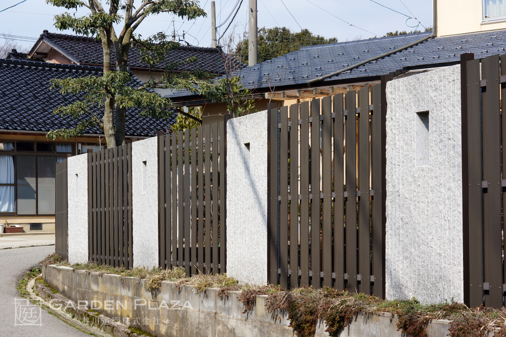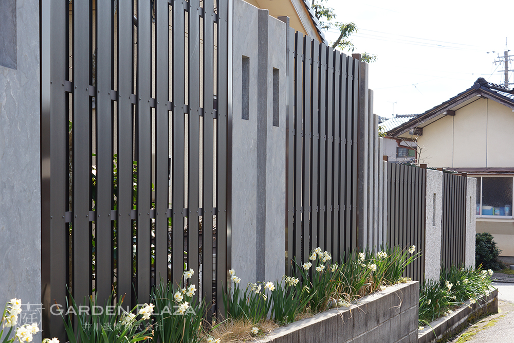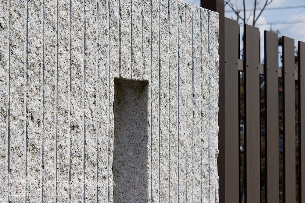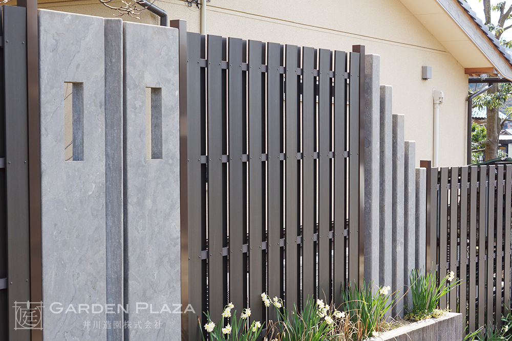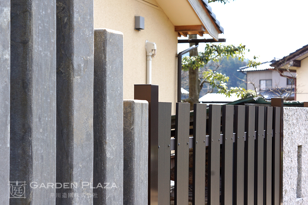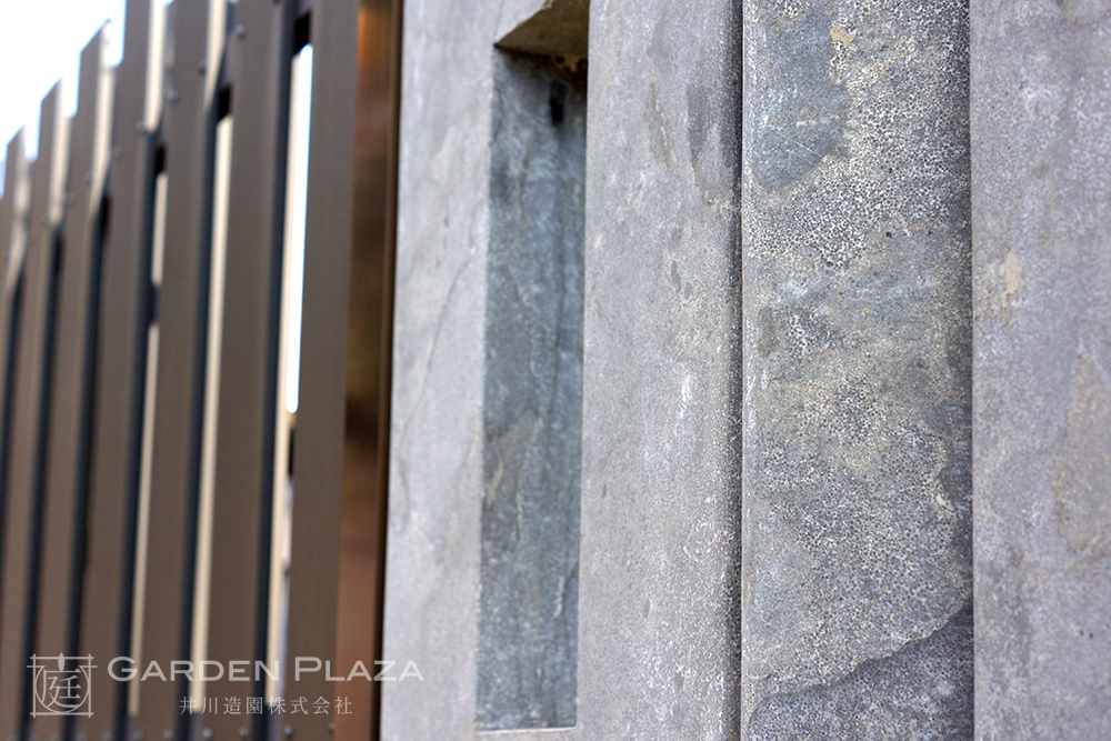 自然素材ならではの風合いを持つ石柱と、 直線的で洗練されたアルミフェンスを 組み合わせた外構デザイン。 異素材を調和させることで、 重たくなりすぎず、 上質で落ち着いた佇まいを演出。 建物との一体感を大切にしたフェンス設計。