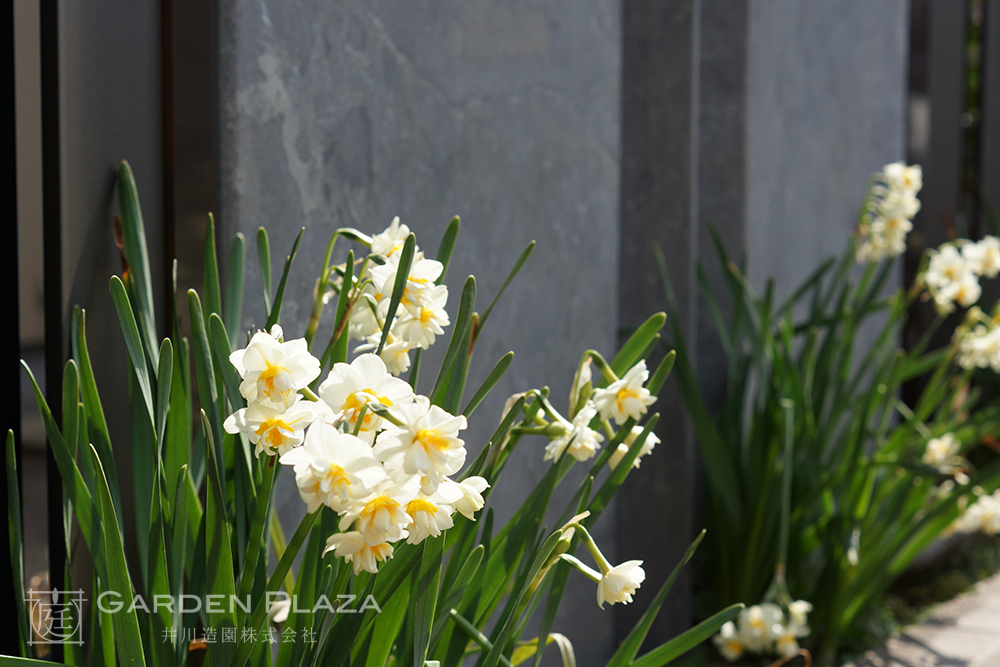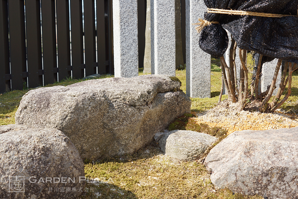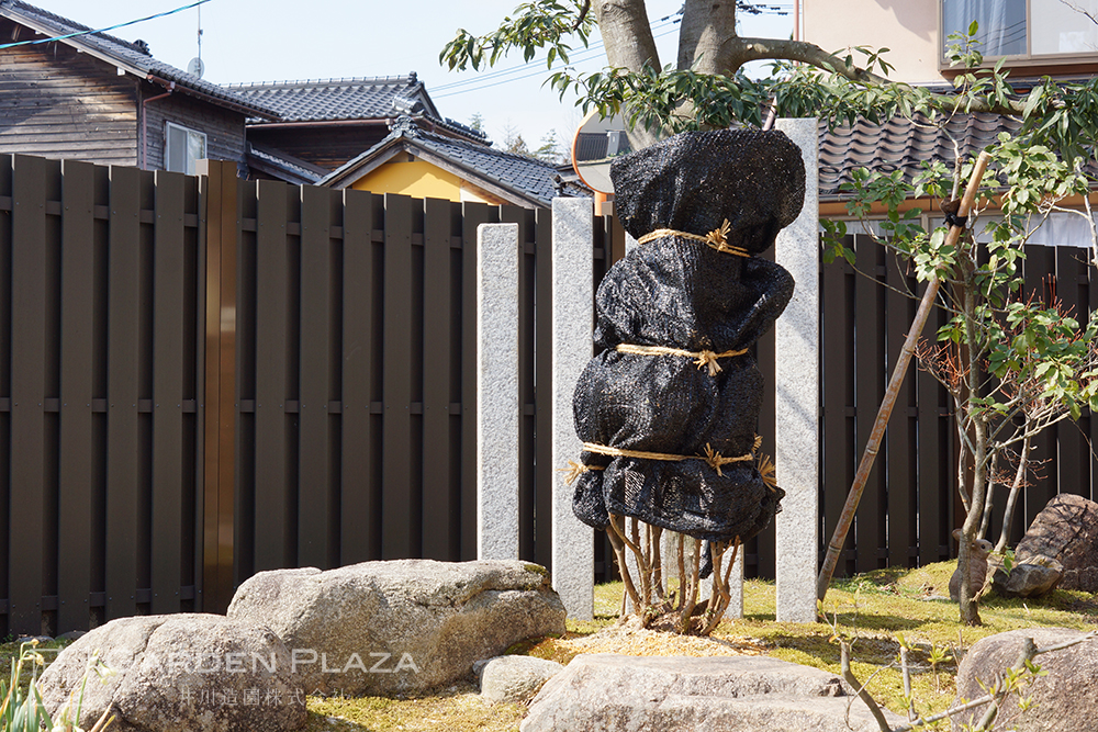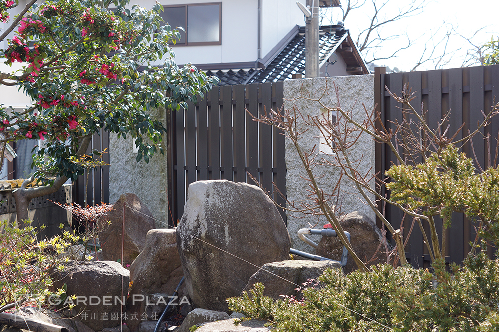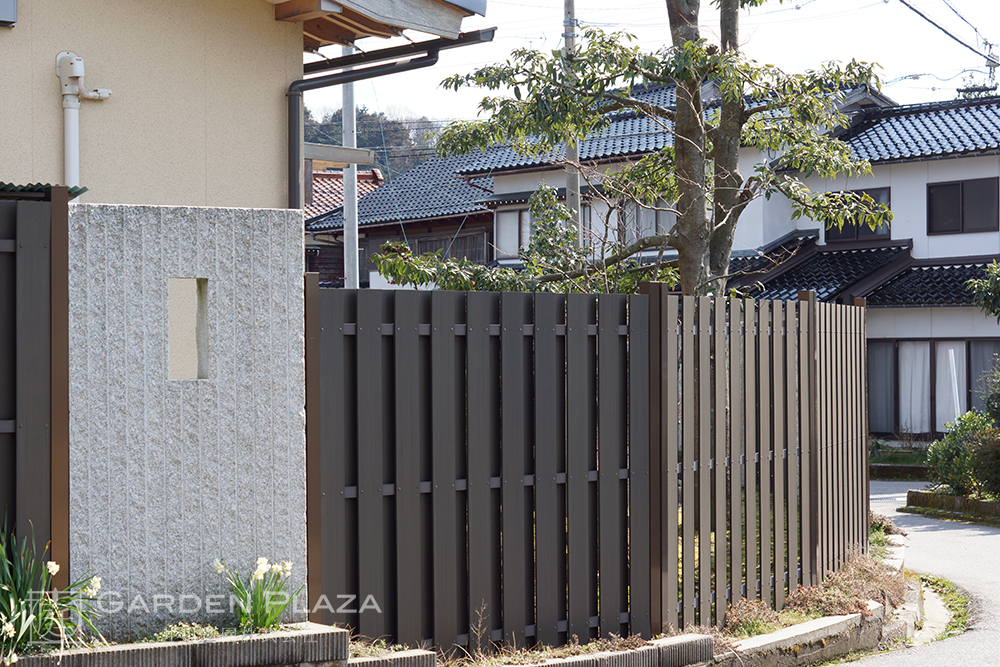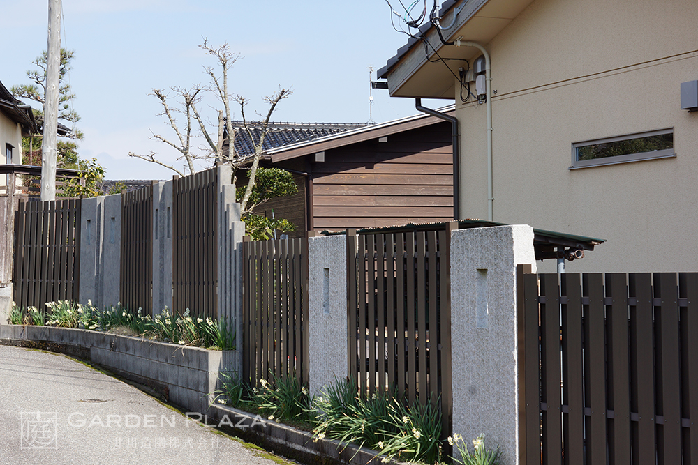 自然素材ならではの風合いを持つ石柱と、 直線的で洗練されたアルミフェンスを 組み合わせた外構デザイン。 異素材を調和させることで、 重たくなりすぎず、 上質で落ち着いた佇まいを演出。 建物との一体感を大切にしたフェンス設計。