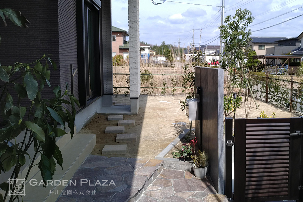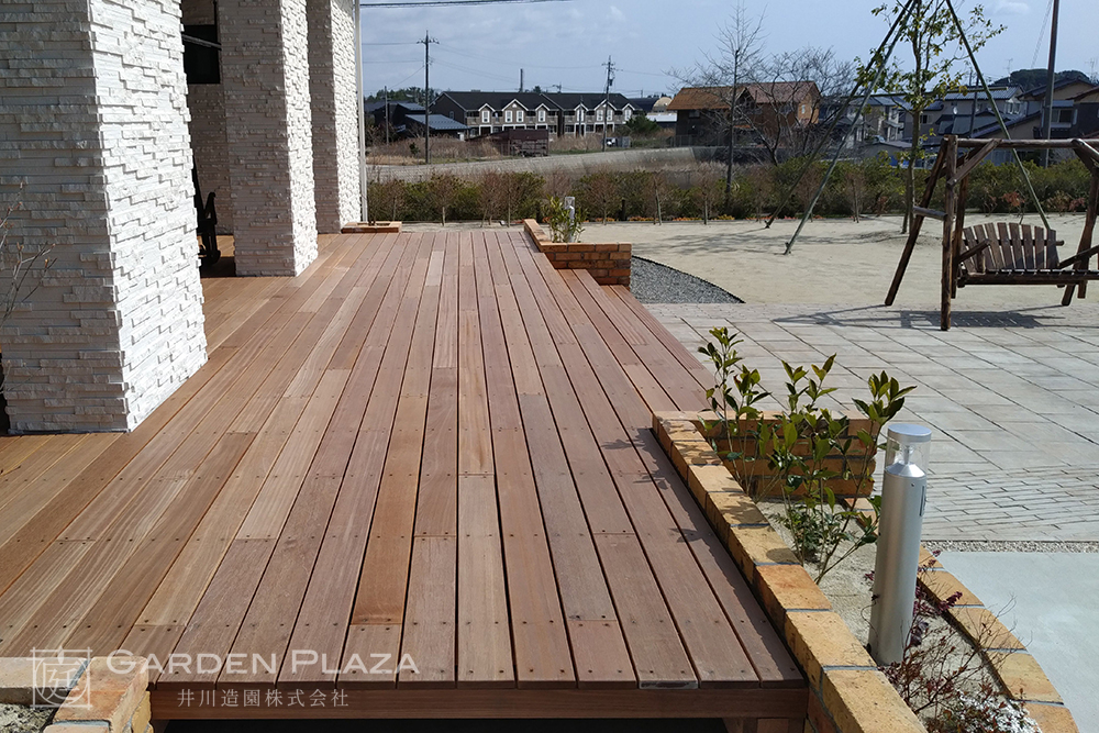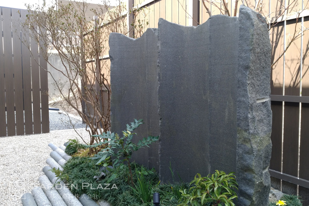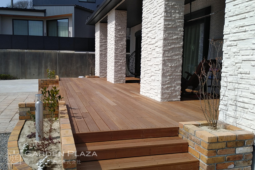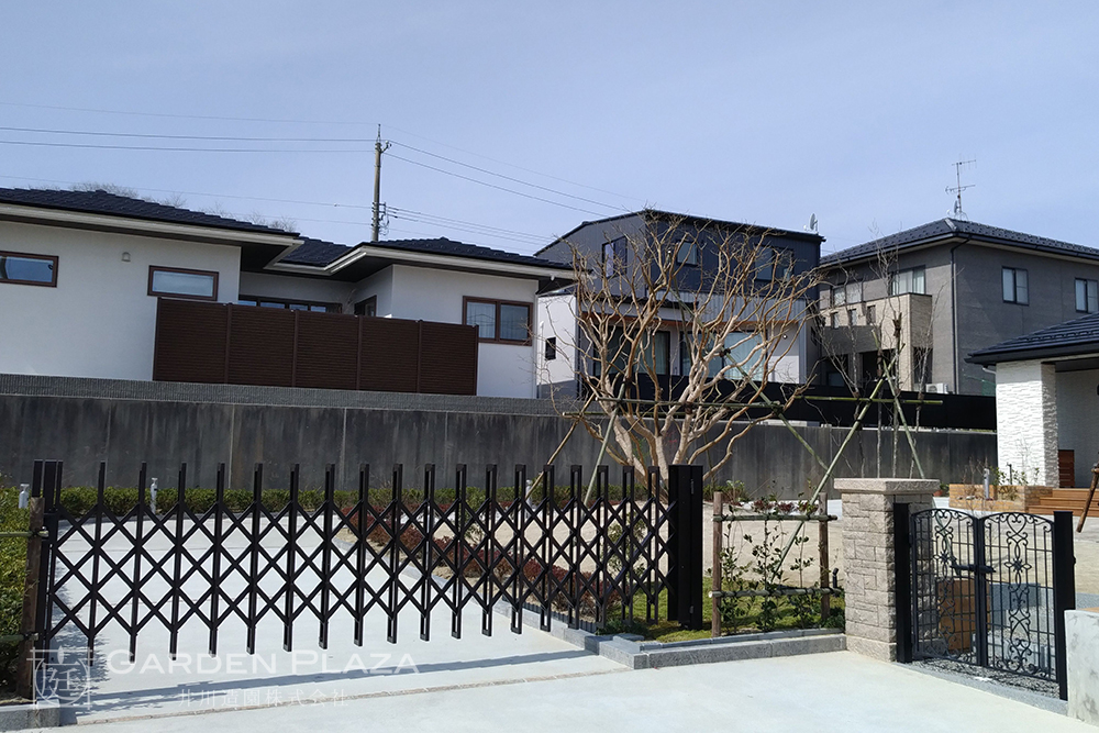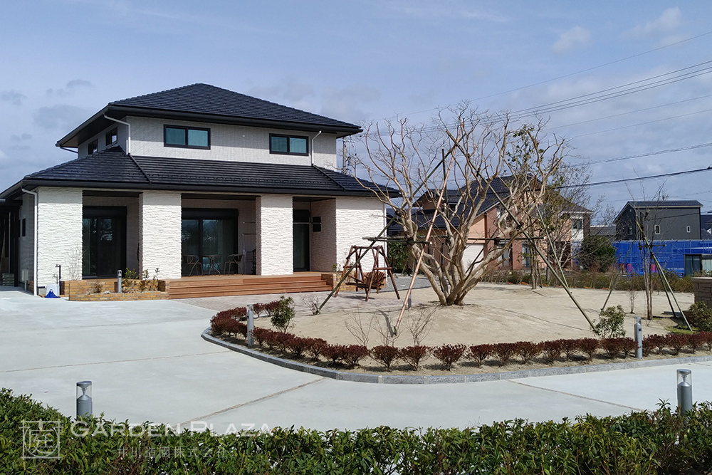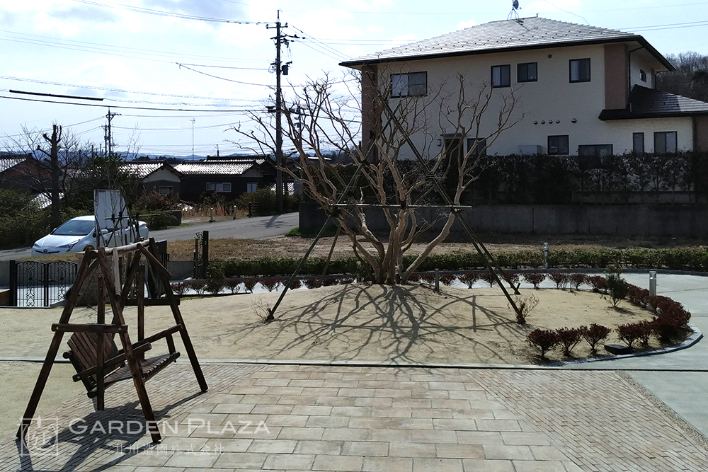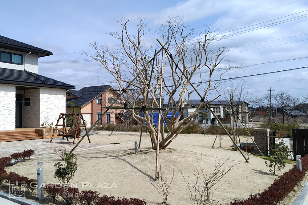 サルスベリが主役になる石柱とハードウッドの洗練ガーデン