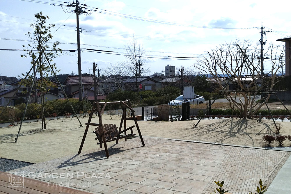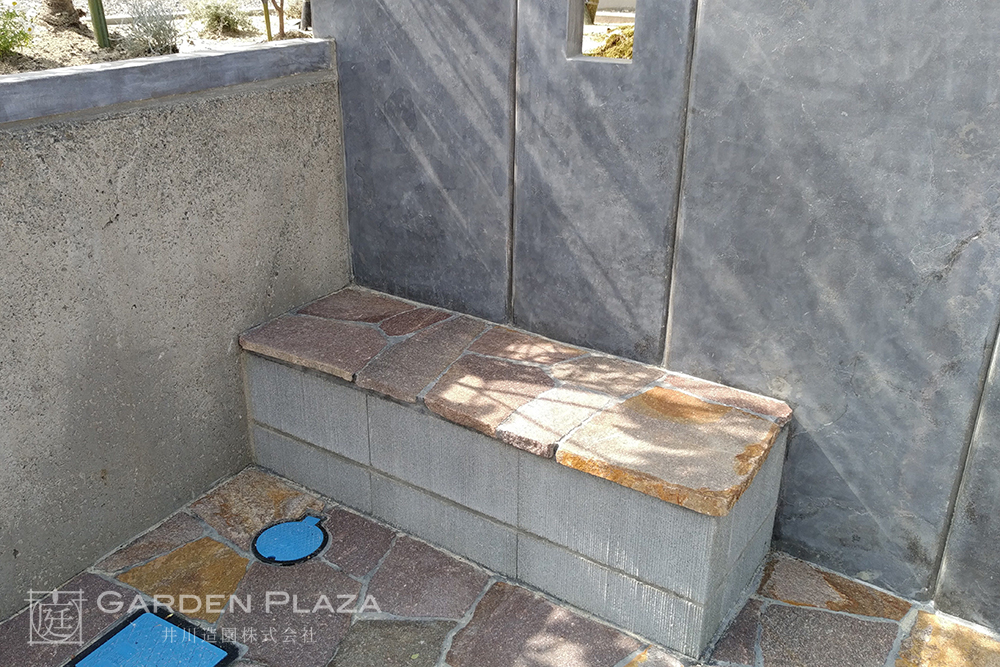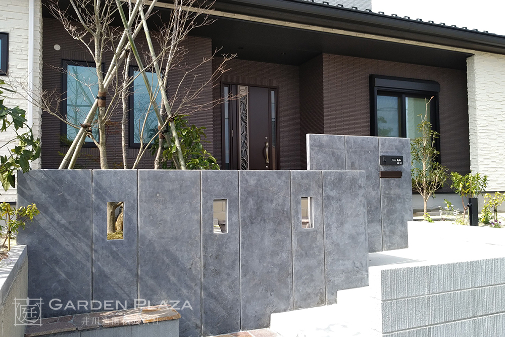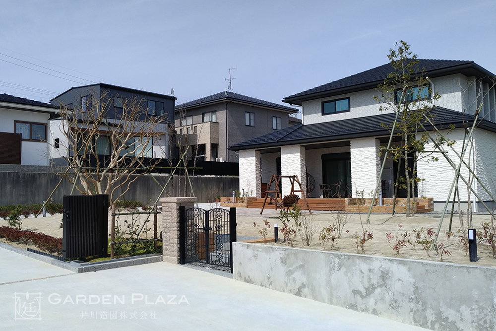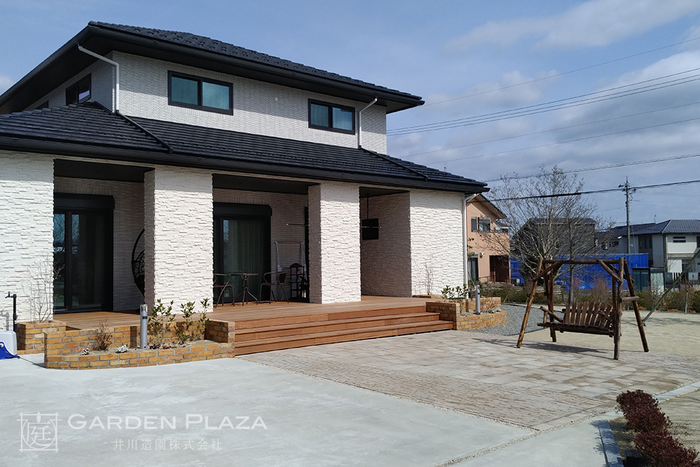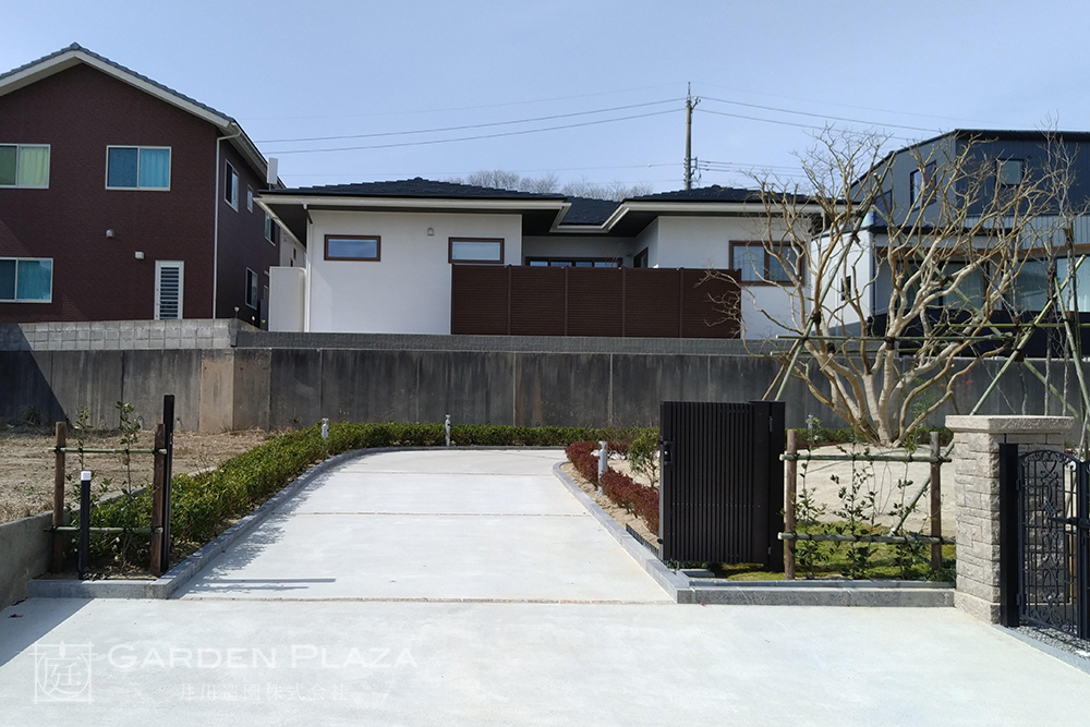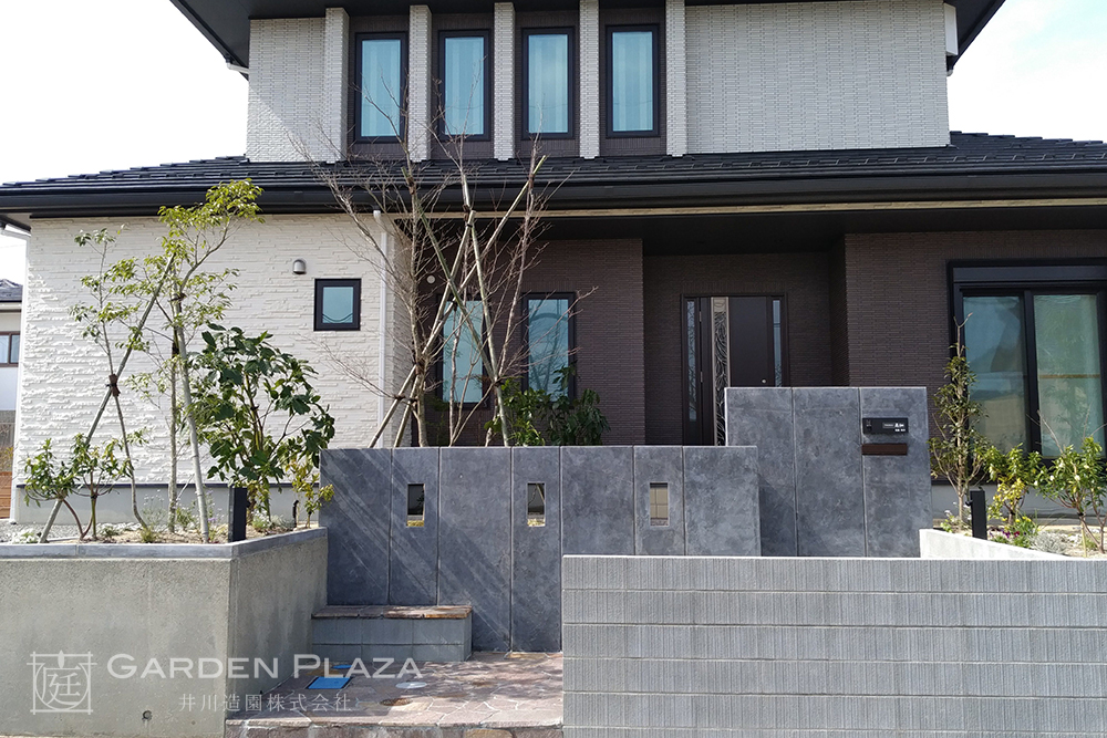サルスベリが主役になる石柱とハードウッドの洗練ガーデン