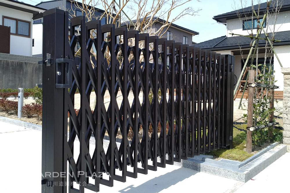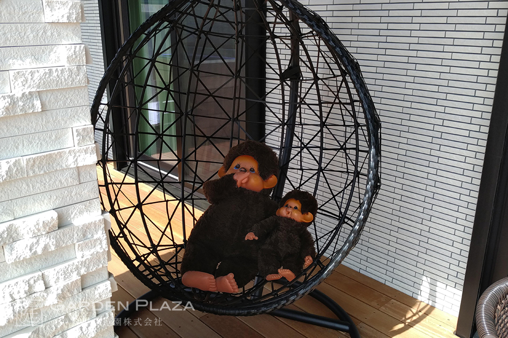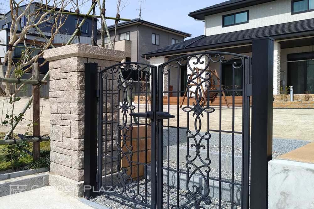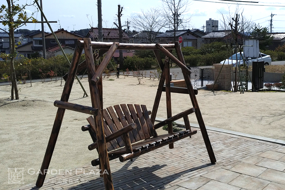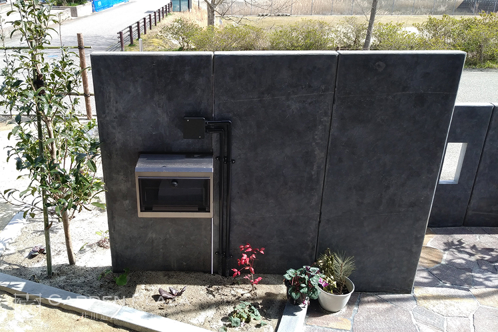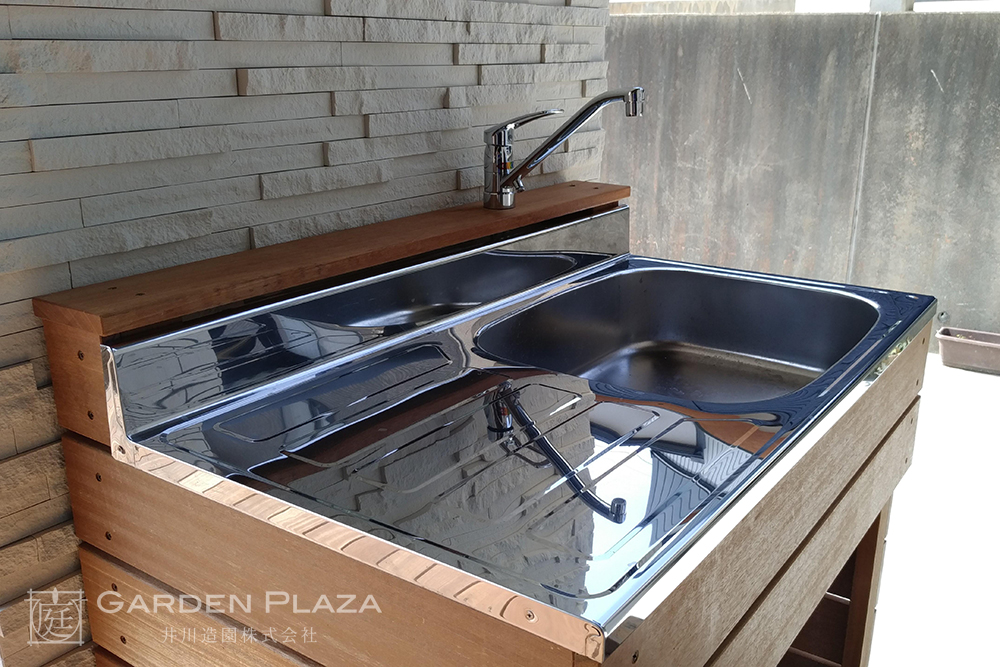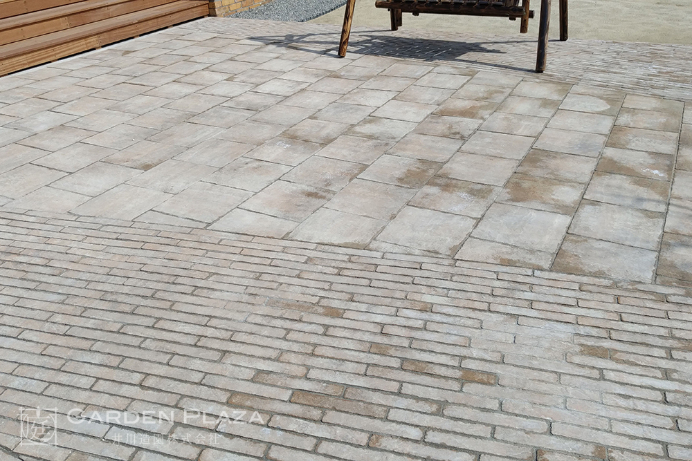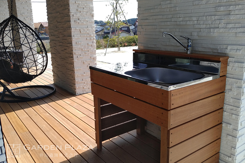 サルスベリが主役になる石柱とハードウッドの洗練ガーデン