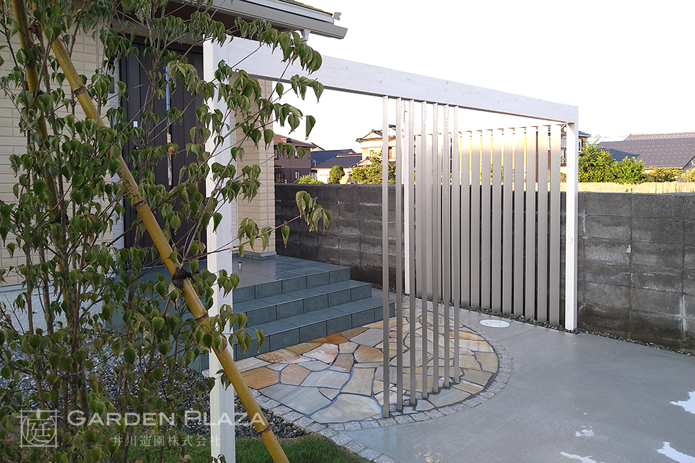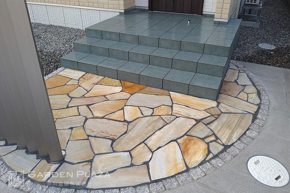 ランダムに敷き詰めた乱張りのアプローチが、