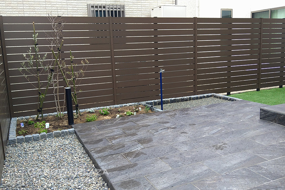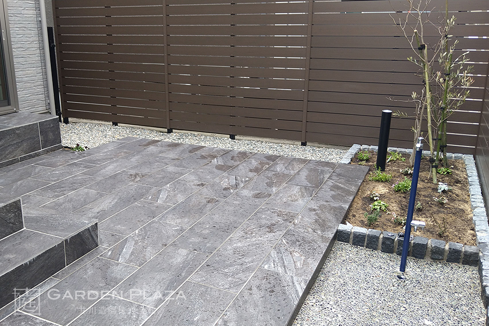 ステップとタイルで魅せるアプローチと憩いの場。 心地よく外とつながる、 立体的なアウトドアリビング。 目隠しフェンスで守られた、 家族のプライベート空間。