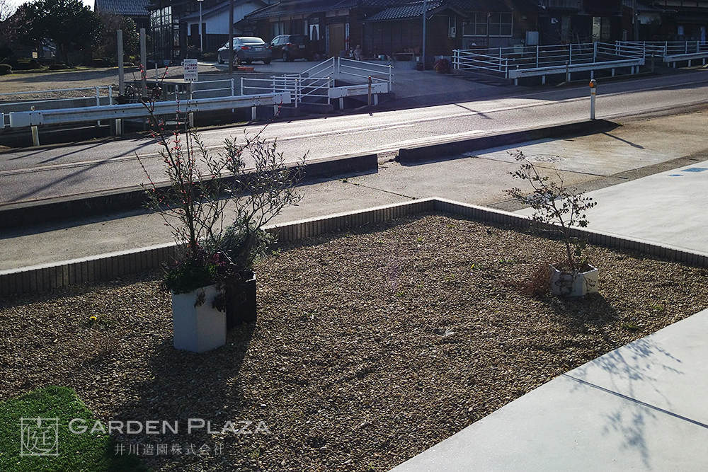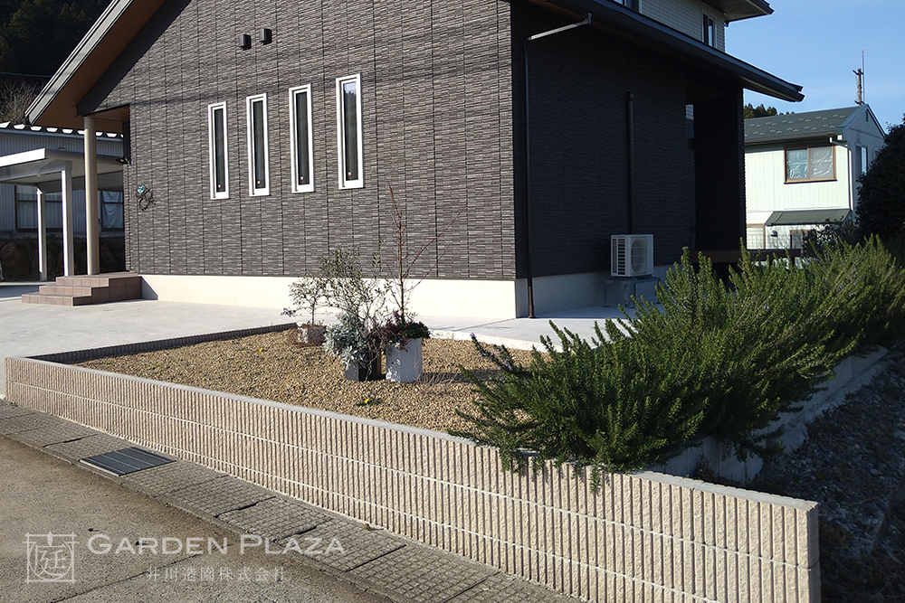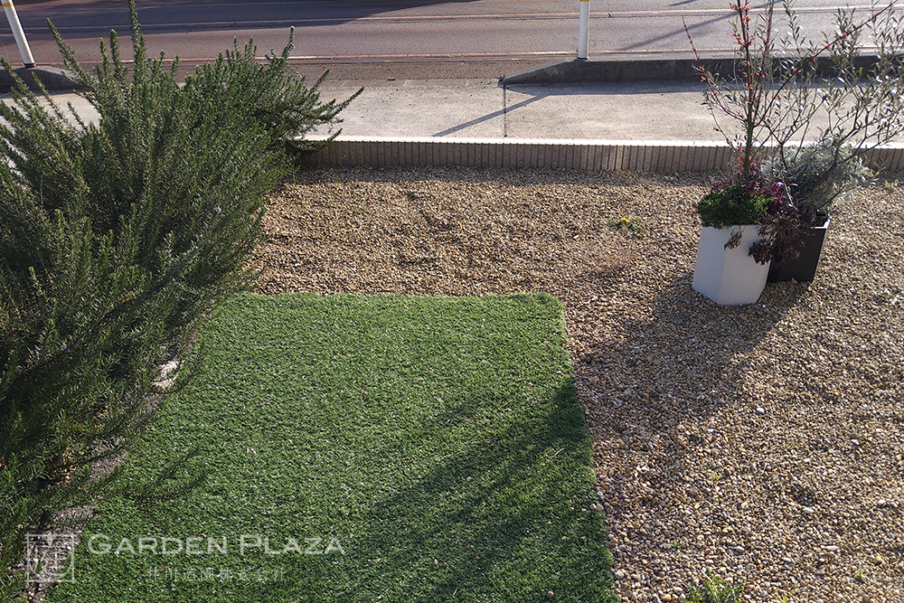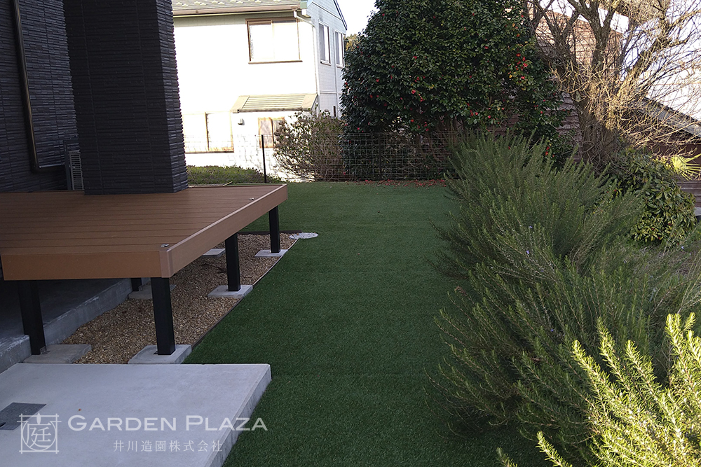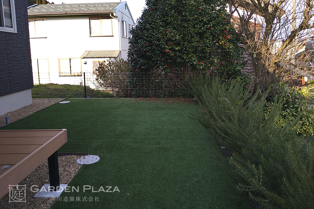 人工芝の絨毯にローズマリーの香りを添えた庭は、 季節を問わず心地よい緑と香りを楽しめる空間。 手入れのしやすさとナチュラルな 雰囲気を両立させることで、 家族が気軽にくつろげる癒しの庭を実現。