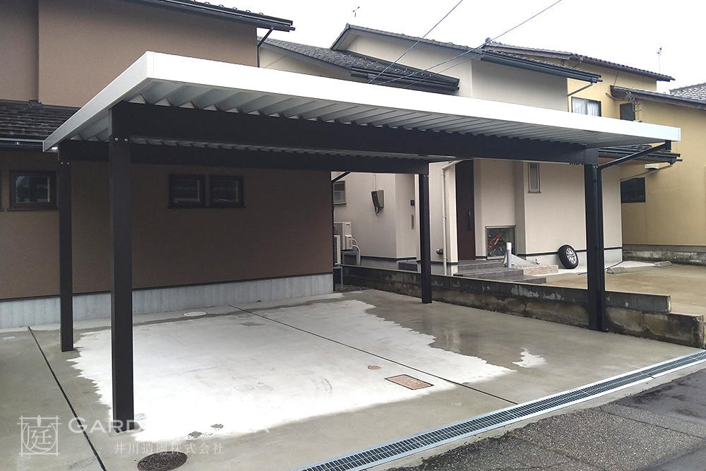 直線的なカーポートとアルミフェンスで