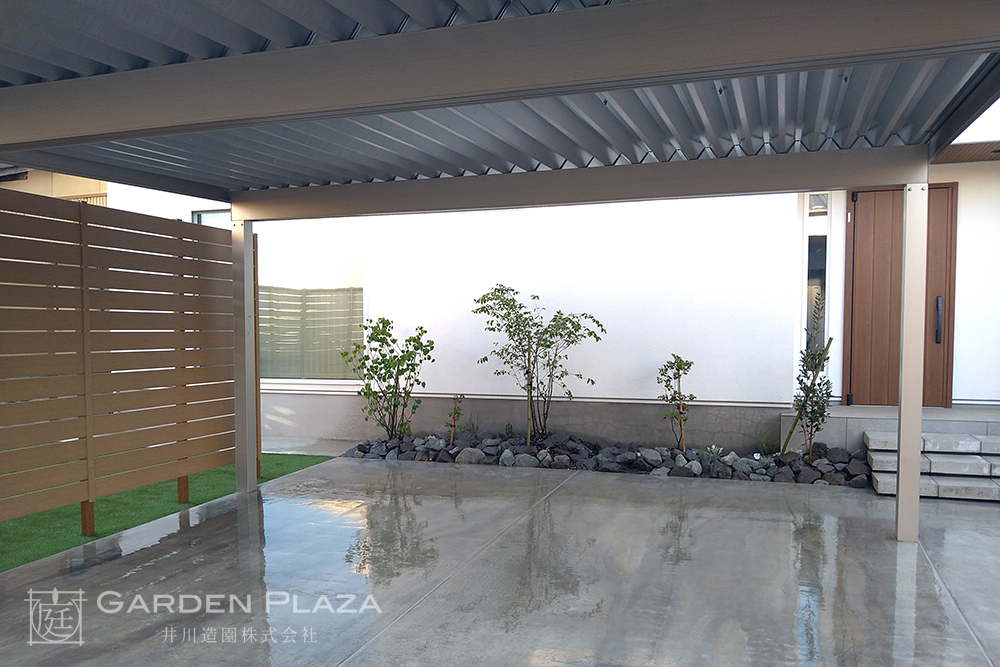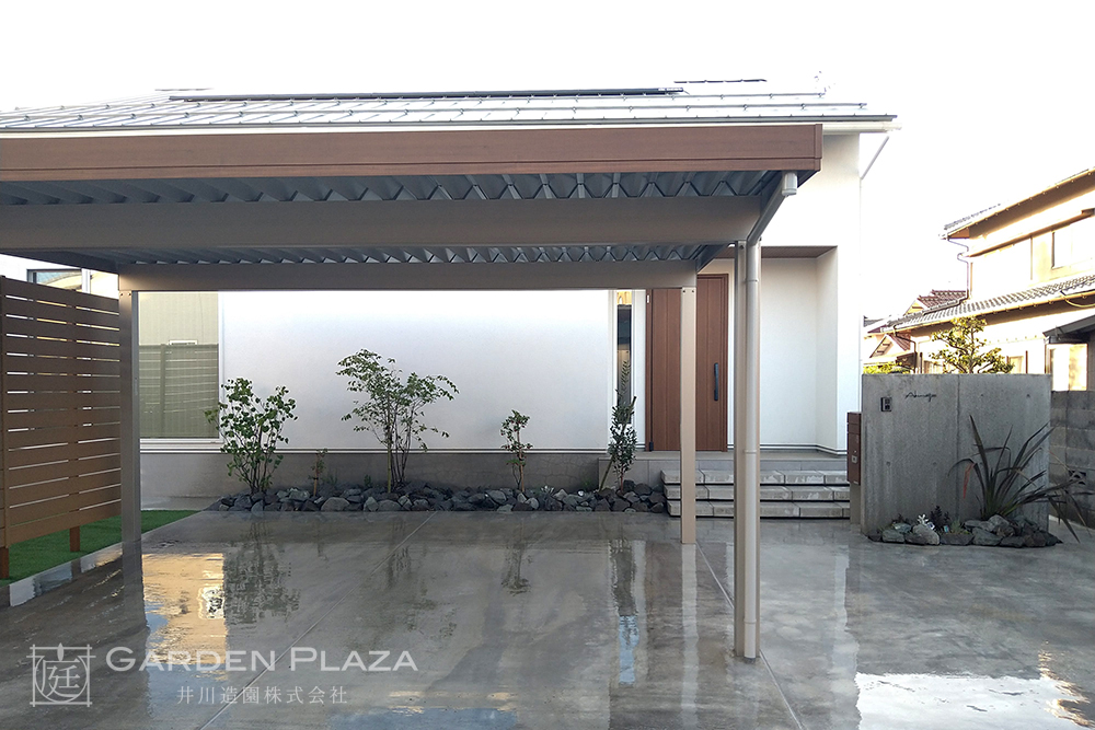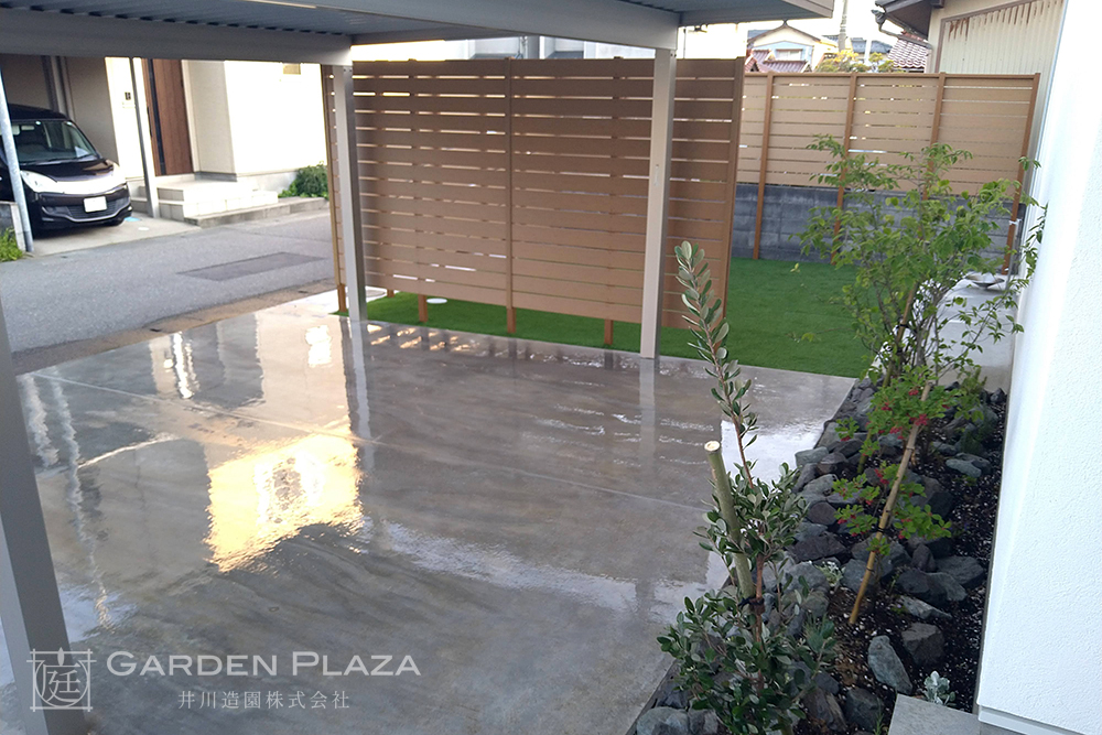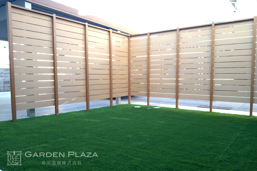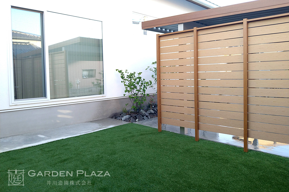 木の質感が美しいウッドフェンスと、 緑が映える人工芝を組み合わせた やさしい印象の外構。 カーポートを設けることで、 機能性も確保し、日常の使いやすさにも配慮。 自然を感じながら、心地よく過ごせる空間に。