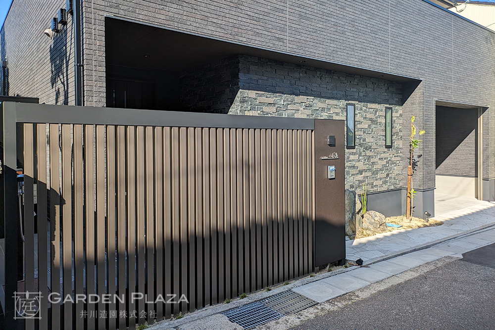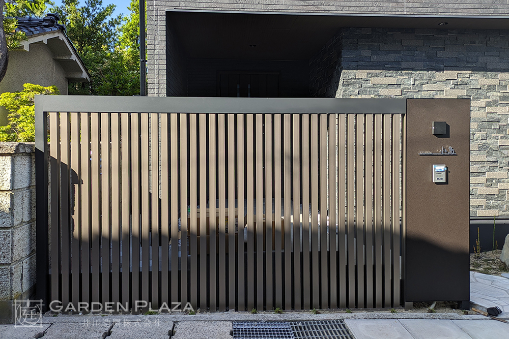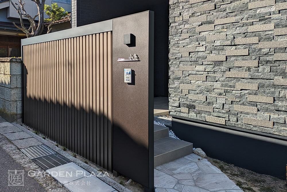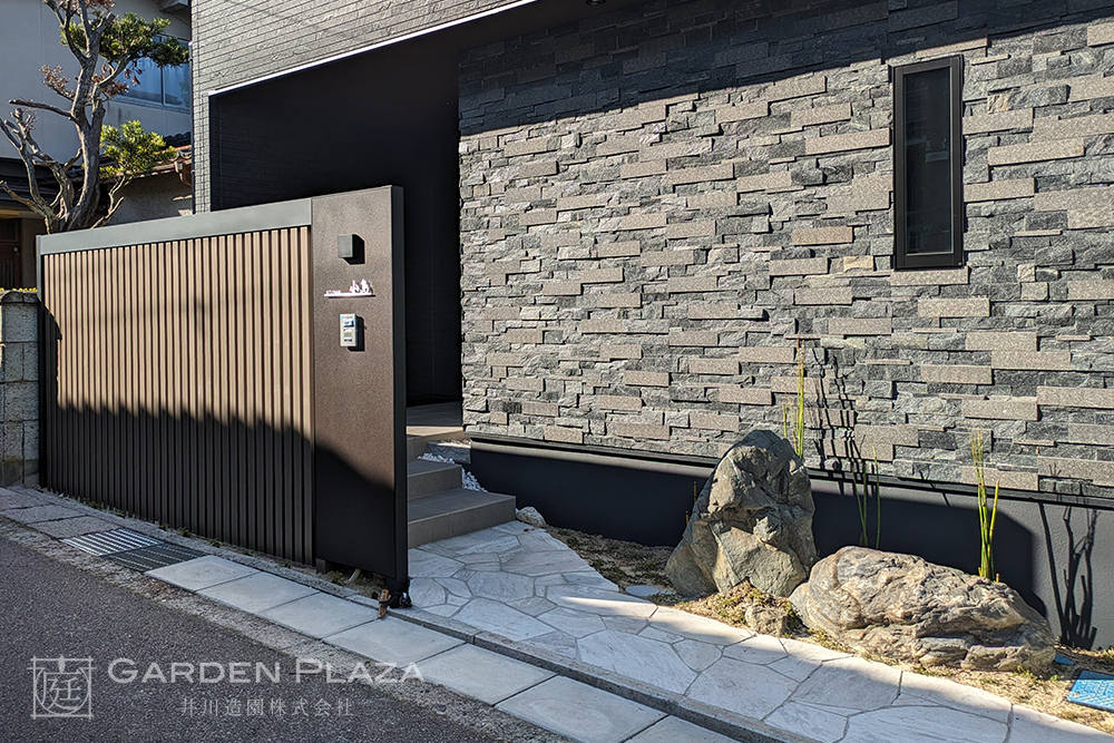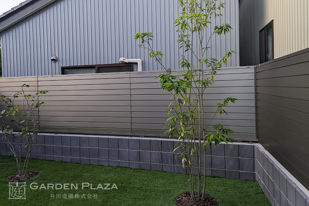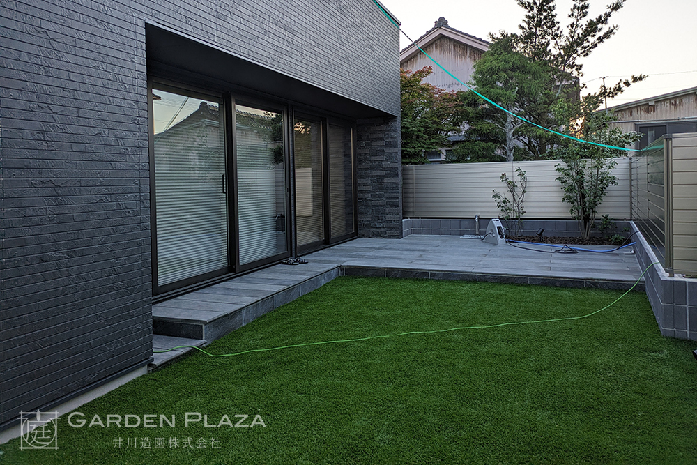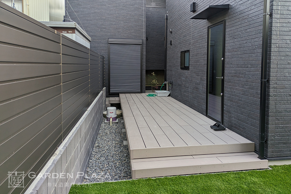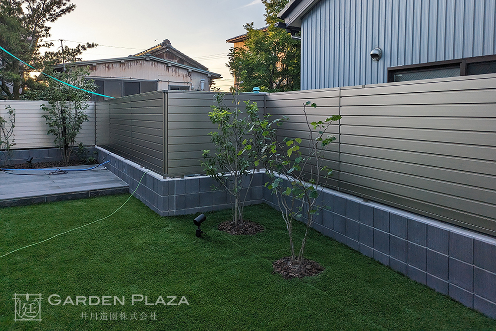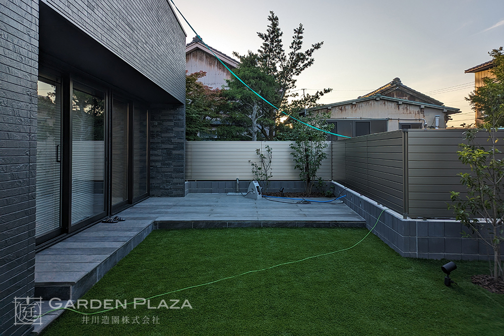 “見せる”と“隠す”を美しく両立させたデザインは、 アートウッドの美しい表情が 外観に洗練された印象を与える。 人工芝が広がる庭は、 緑に包まれた心地よい暮らしを実現し、 上質でくつろげる空間を演出。 重厚感と美しさを兼ね備えたストーンデッキは、 贅沢な時間を過ごすための特別な場所として、 庭全体の価値を高める。