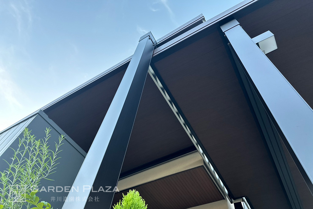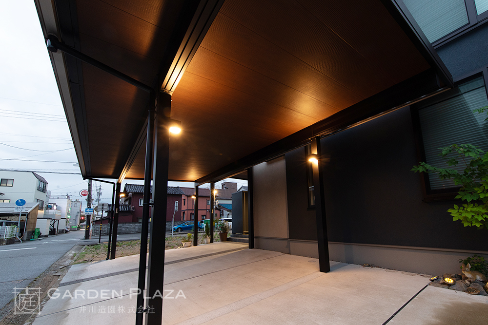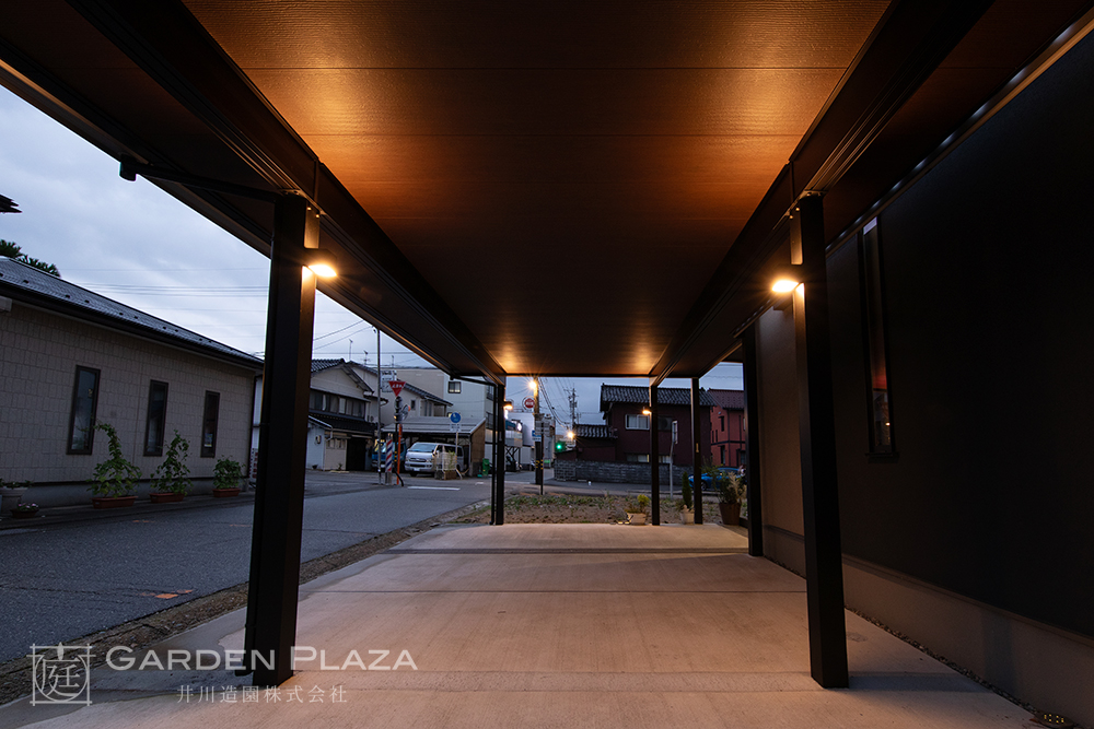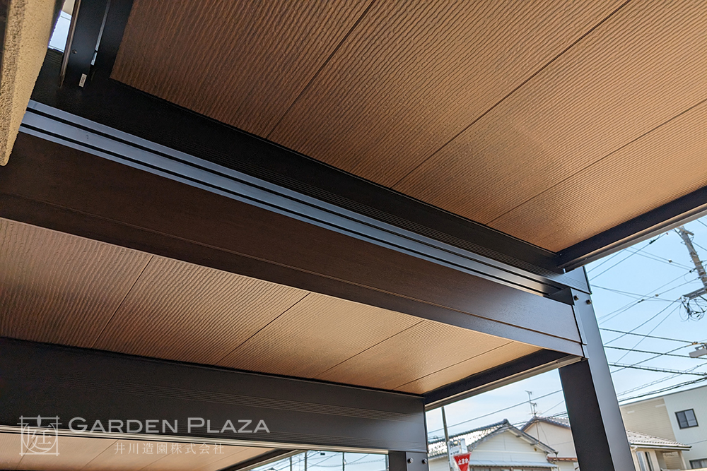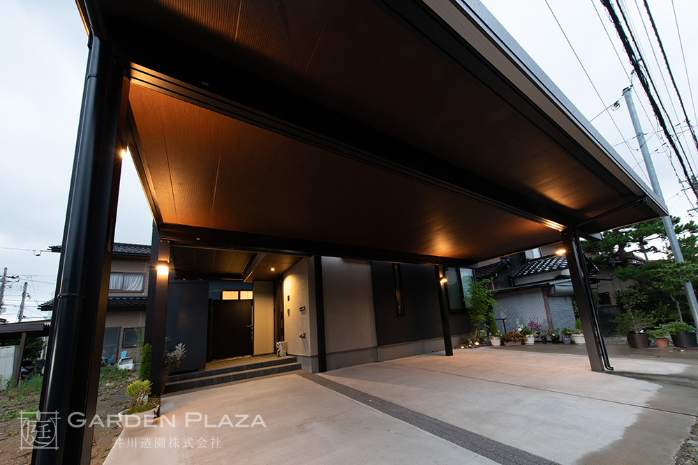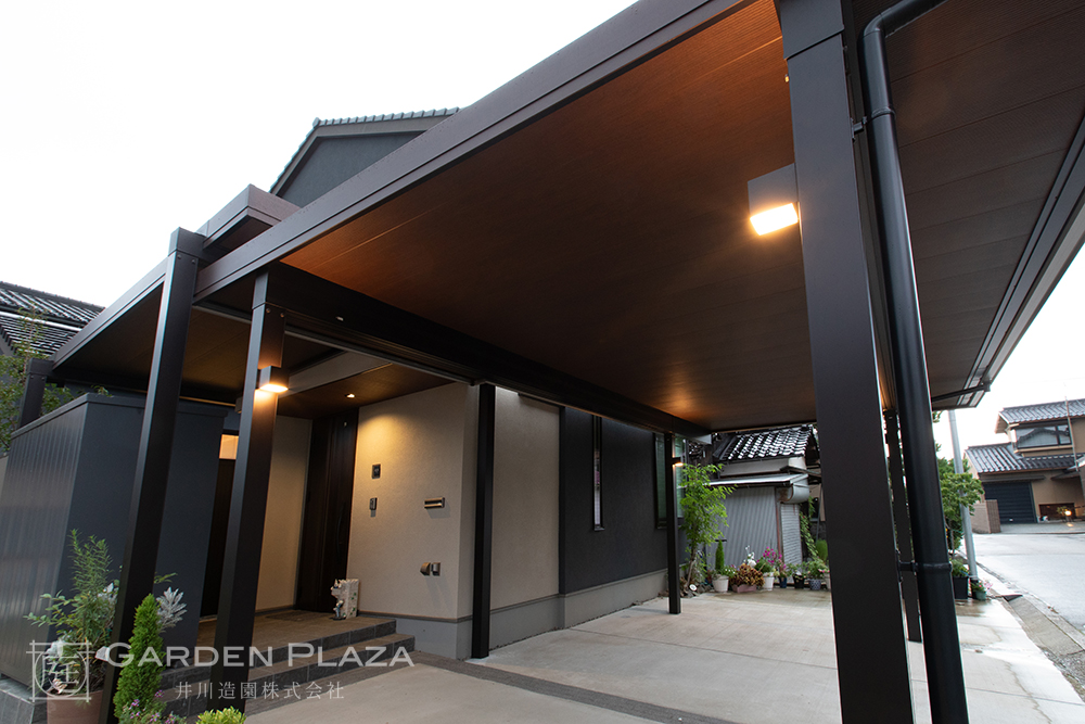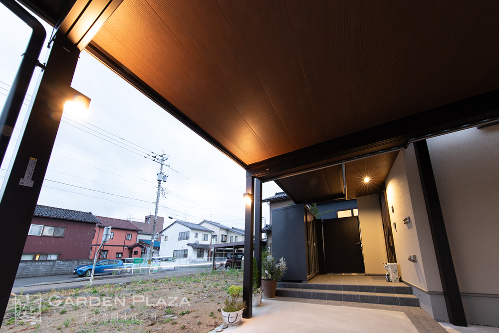 建物の意匠に合わせて軒天パネルの カーポートをカスタマイズし、 エントランス全体に連続性を。 木目調の軒天材がアクセントとなり、 外観に深みと上質さをプラス。 建築と外構がシームレスにつながる 洗練されたファサードデザイン。