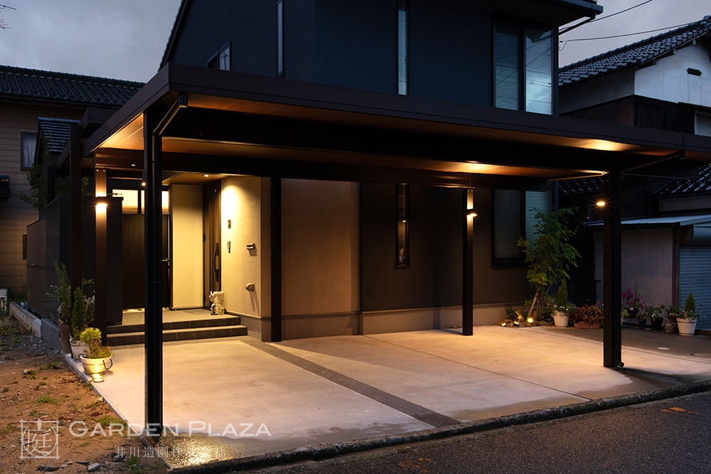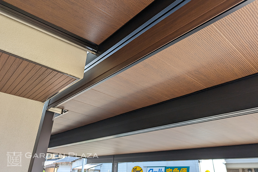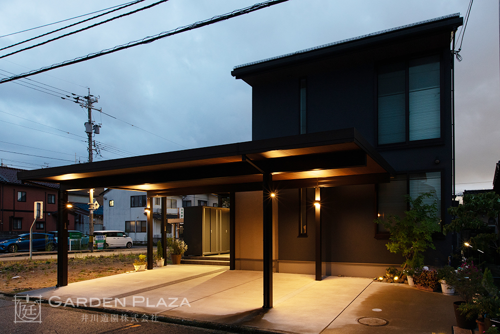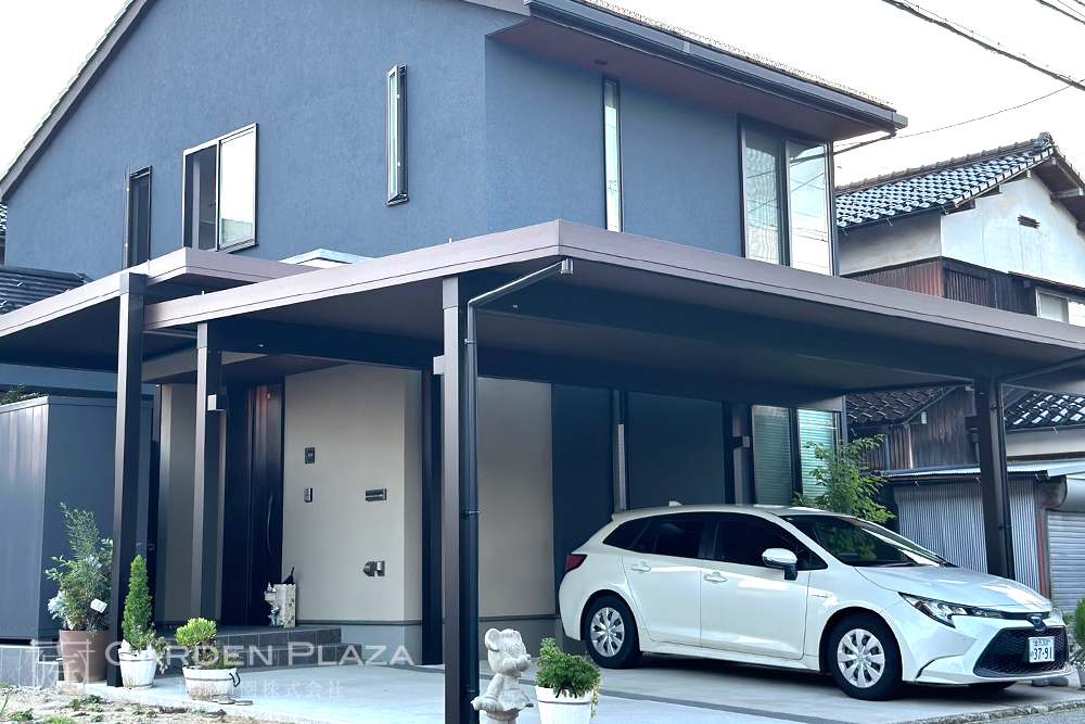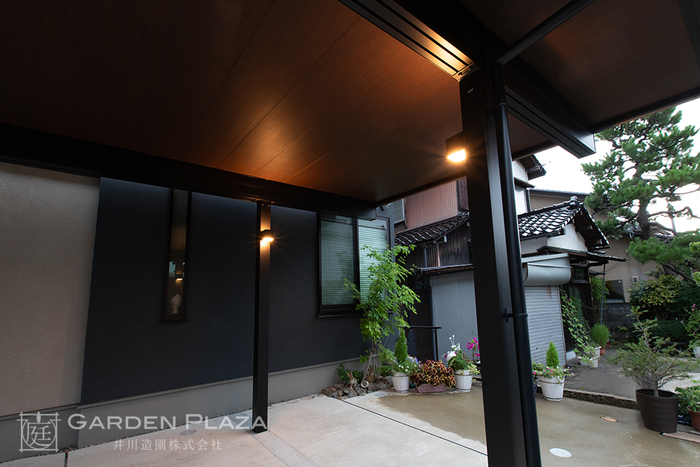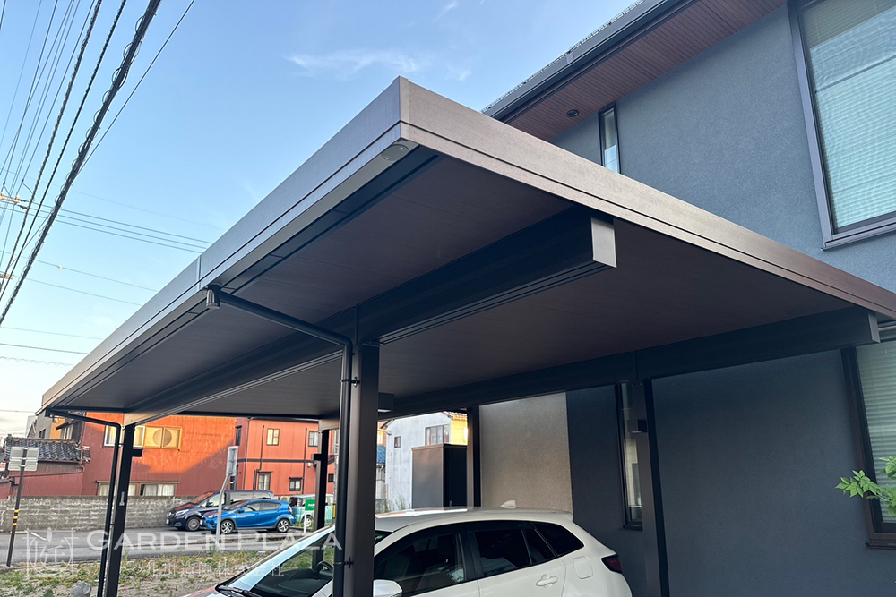 建物の意匠に合わせて軒天パネルの カーポートをカスタマイズし、 エントランス全体に連続性を。 木目調の軒天材がアクセントとなり、 外観に深みと上質さをプラス。 建築と外構がシームレスにつながる 洗練されたファサードデザイン。