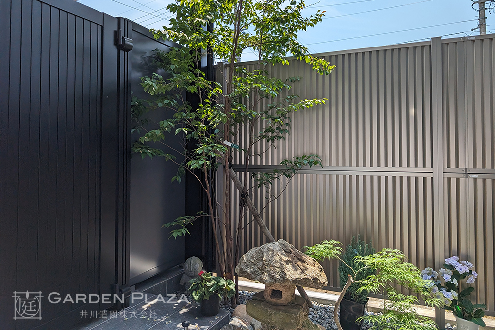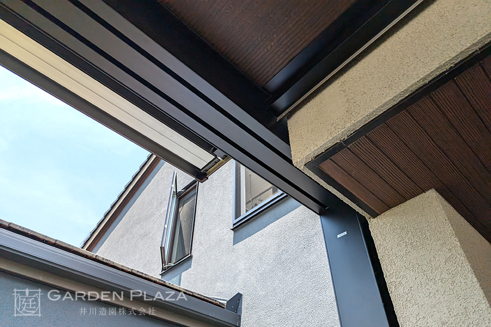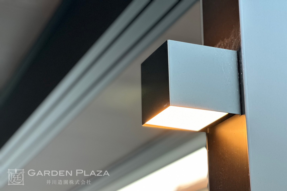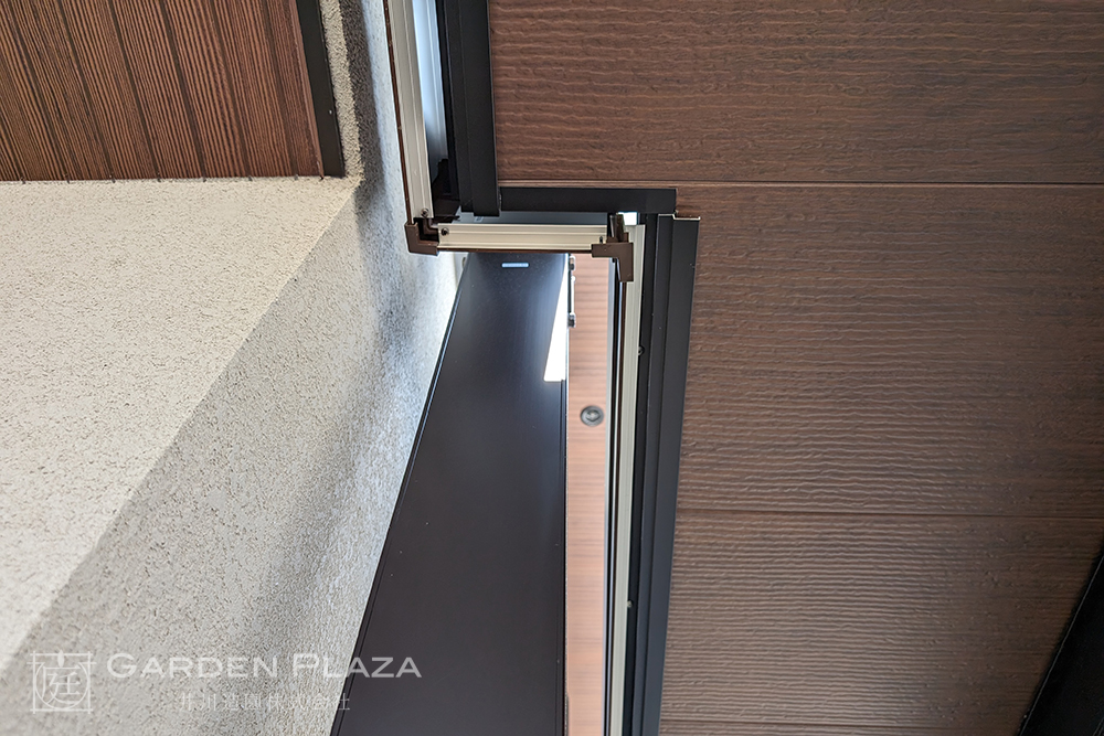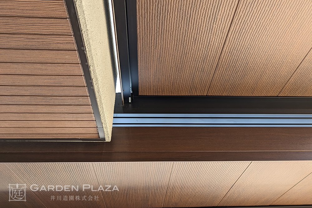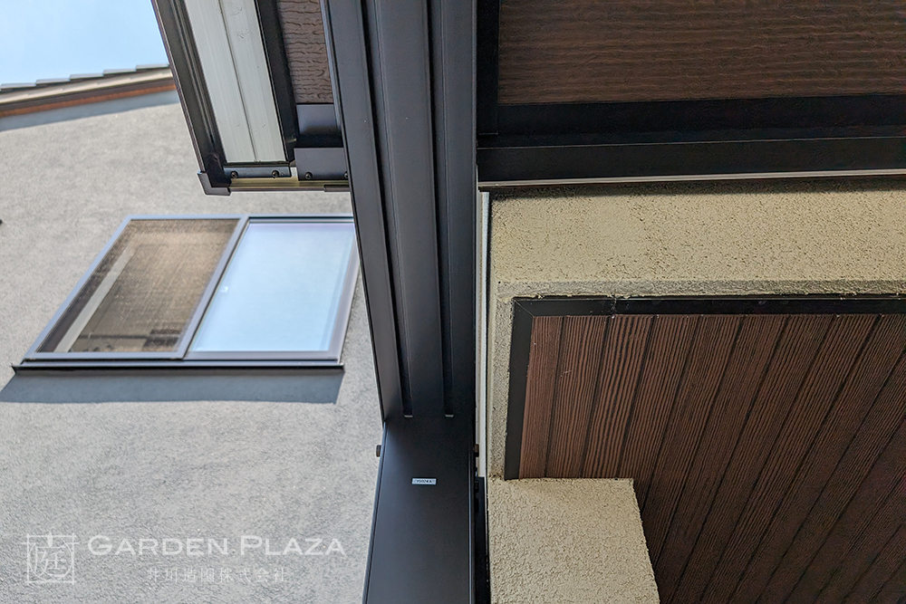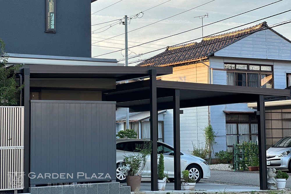 建物の意匠に合わせて軒天パネルの カーポートをカスタマイズし、 エントランス全体に連続性を。 木目調の軒天材がアクセントとなり、 外観に深みと上質さをプラス。 建築と外構がシームレスにつながる 洗練されたファサードデザイン。