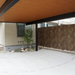 木目調の軒天パネルを組み合わせたカーポート。