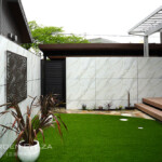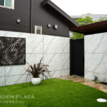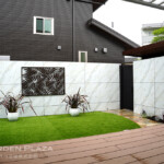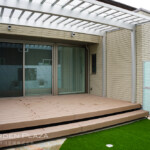 木調のウッドデッキと人工芝を組み合わせ、