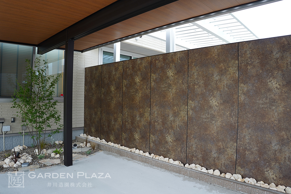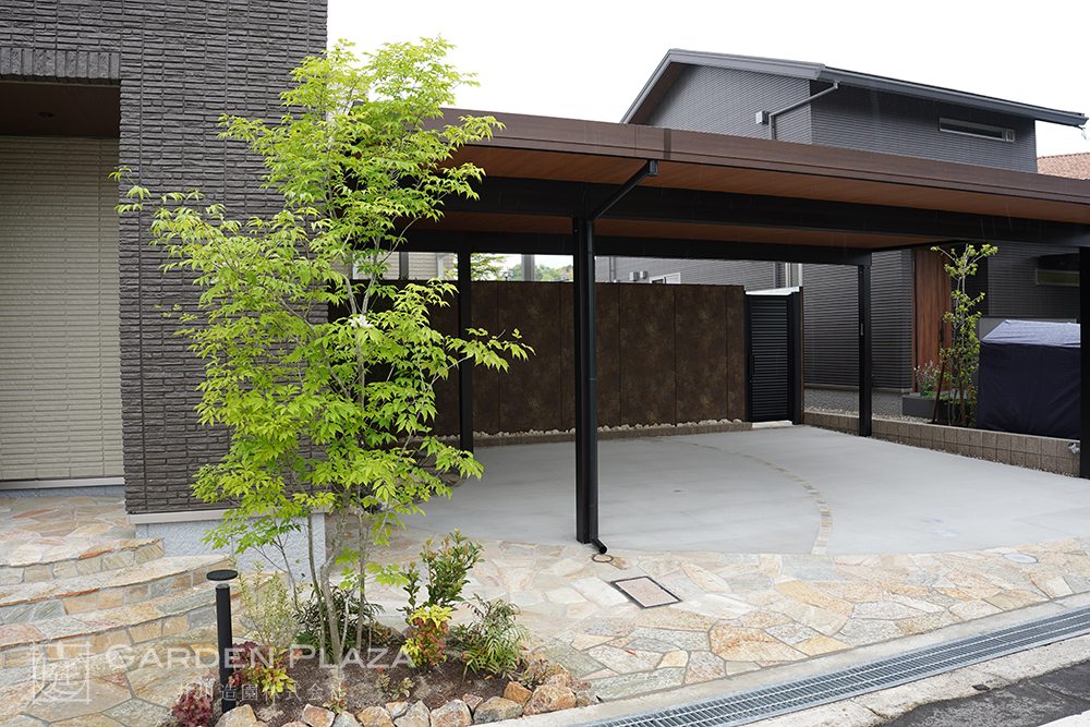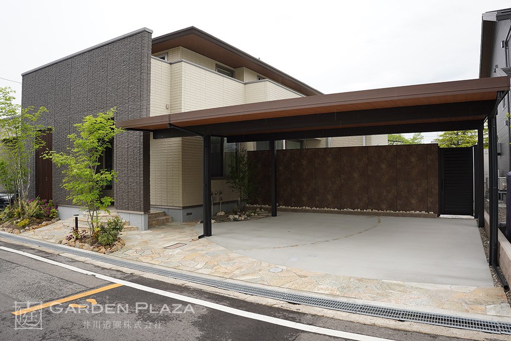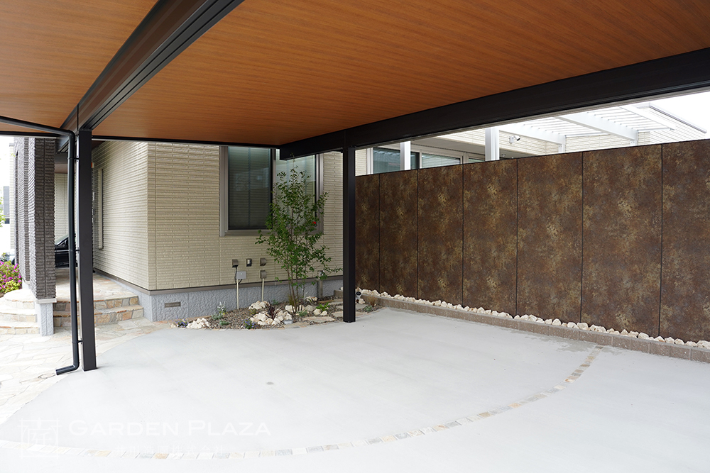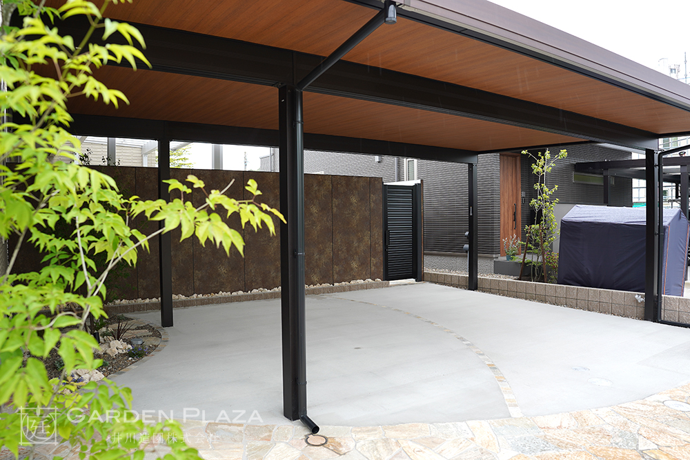 木目調の軒天パネルを組み合わせたカーポート。