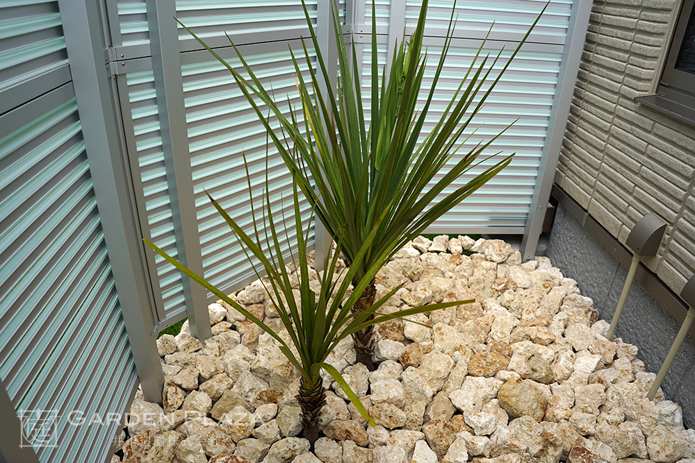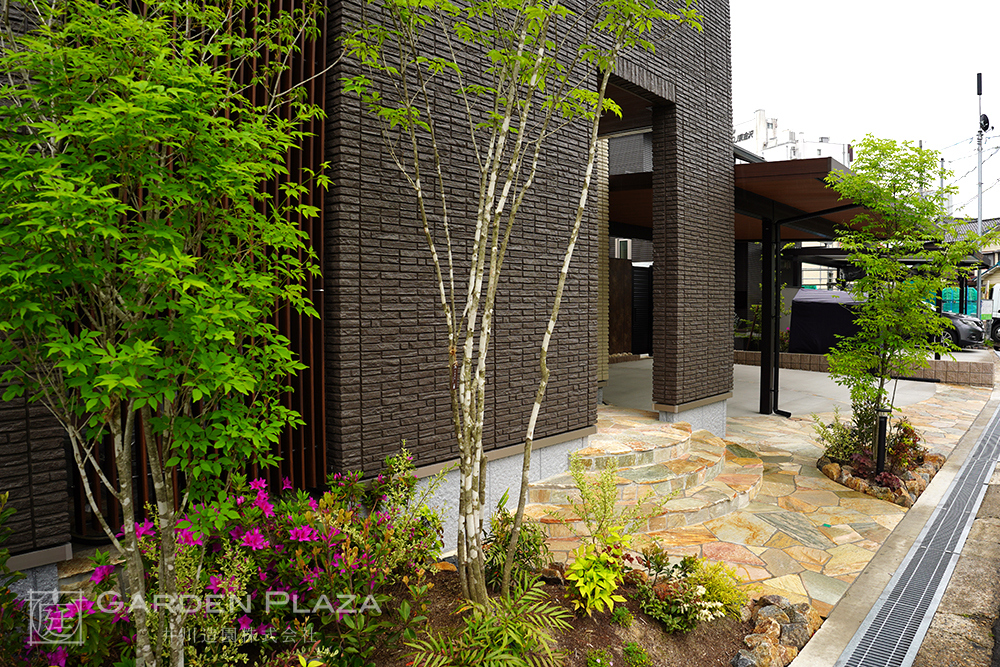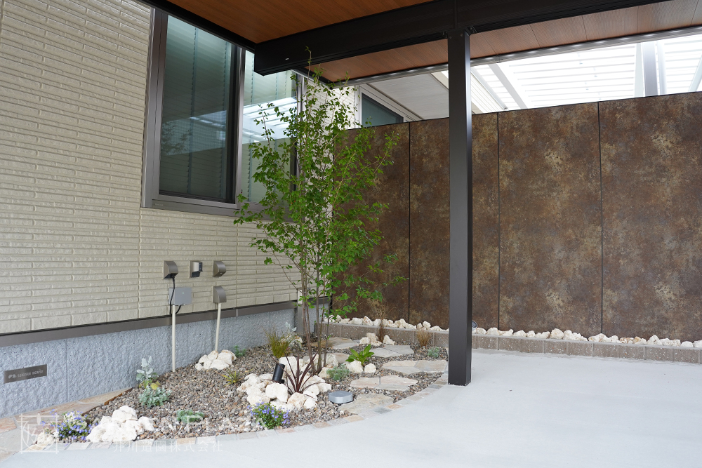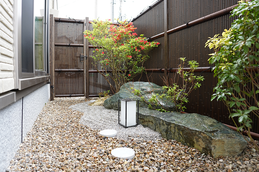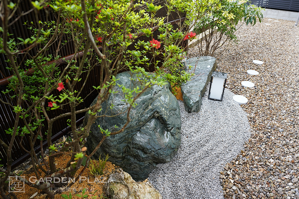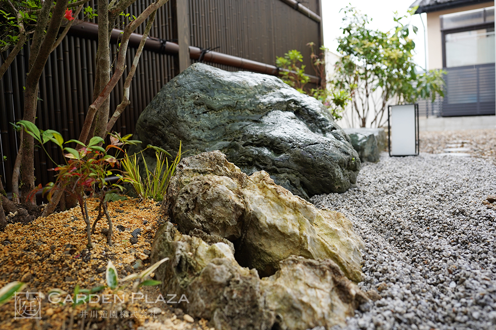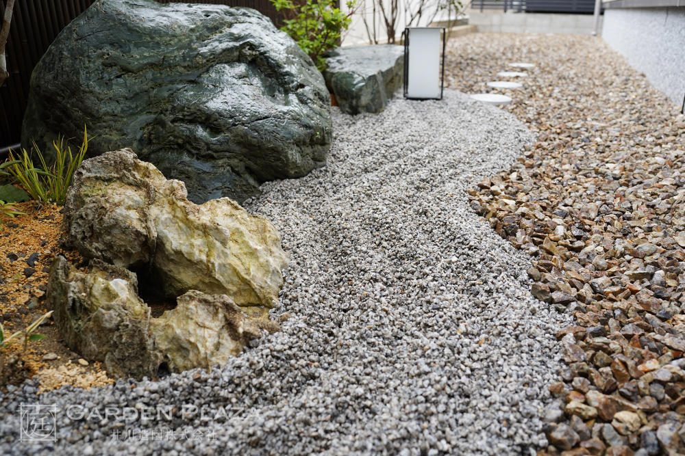 自然石や砂利、植栽を組み合わせた、