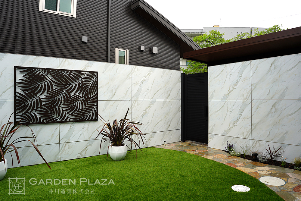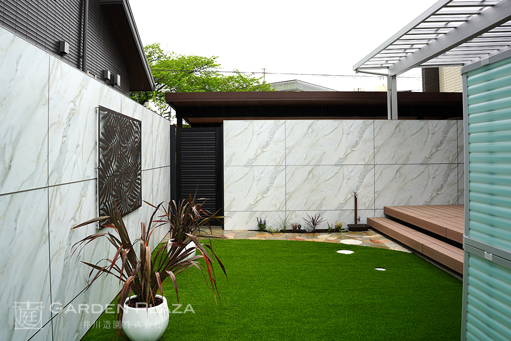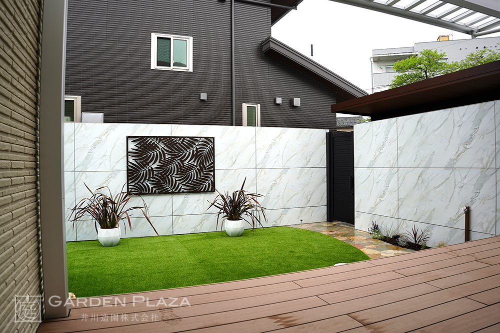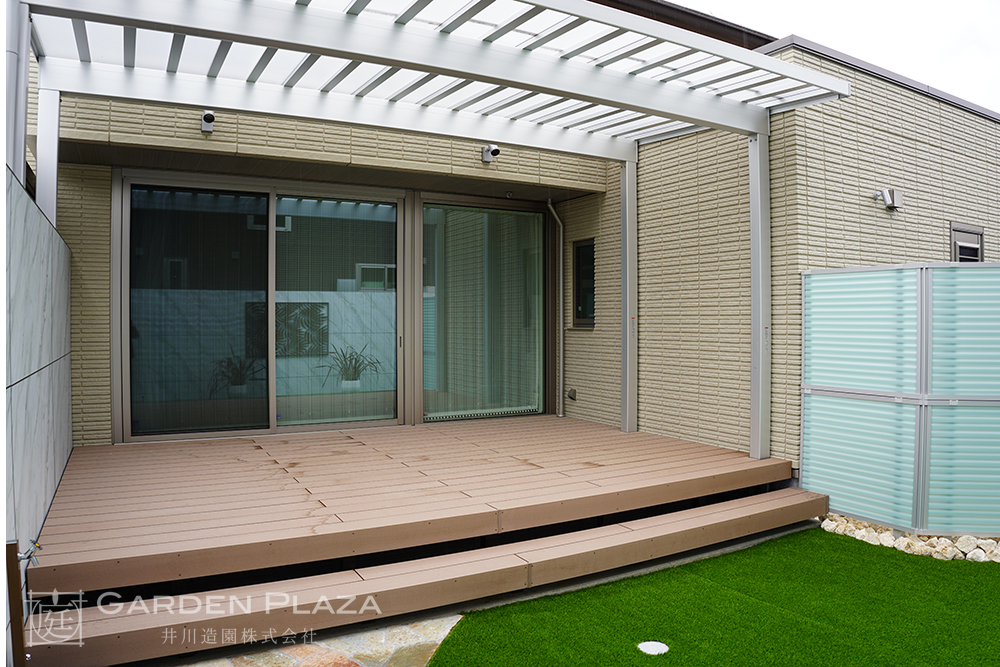 木調のウッドデッキと人工芝を組み合わせ、