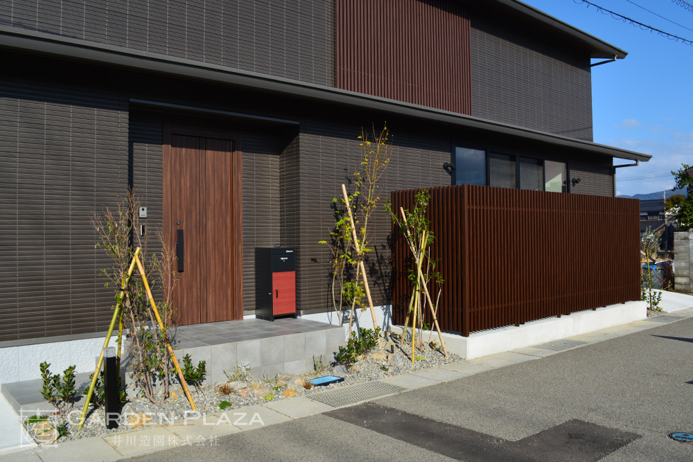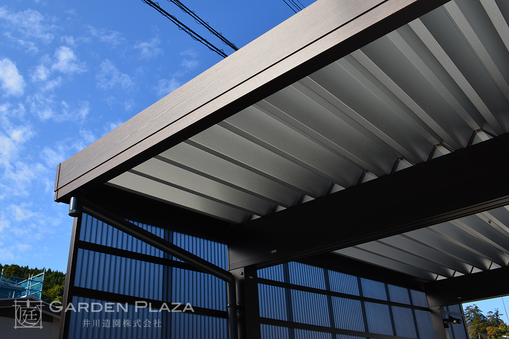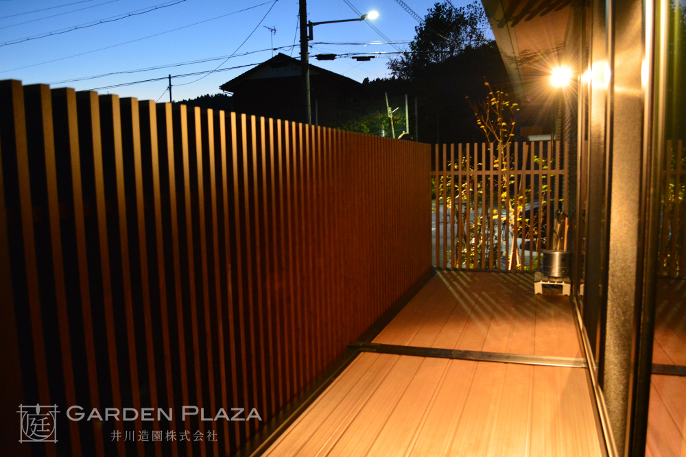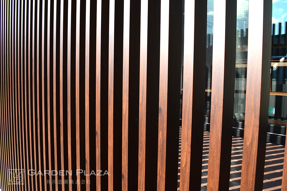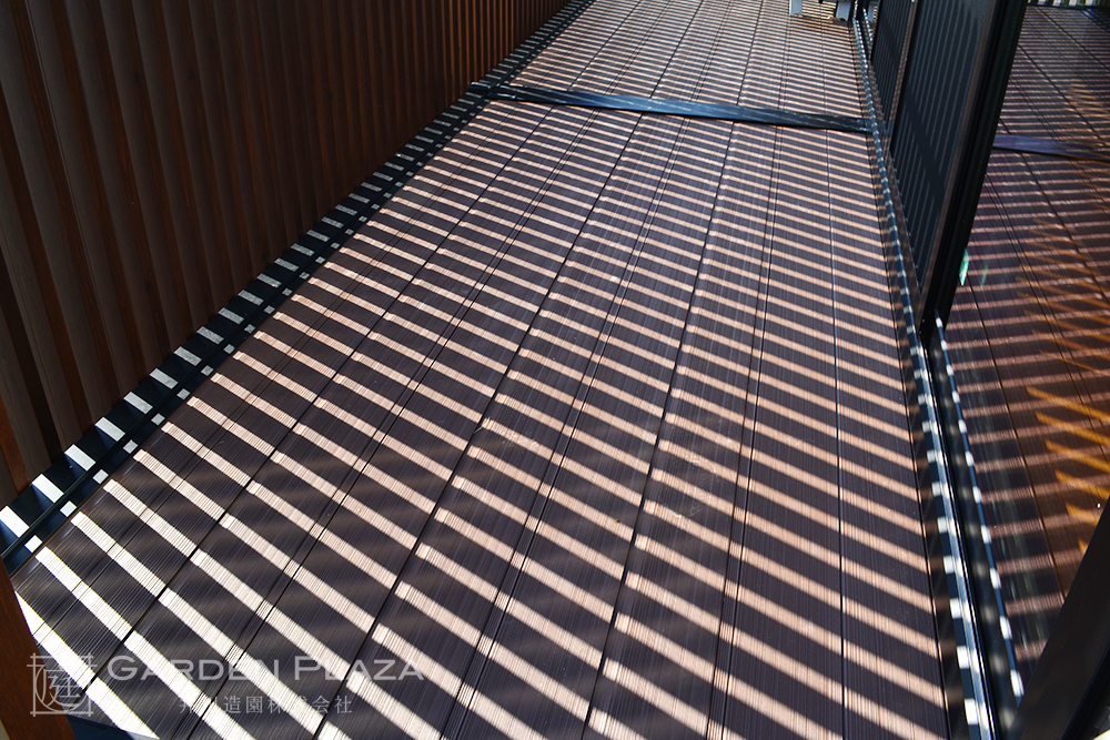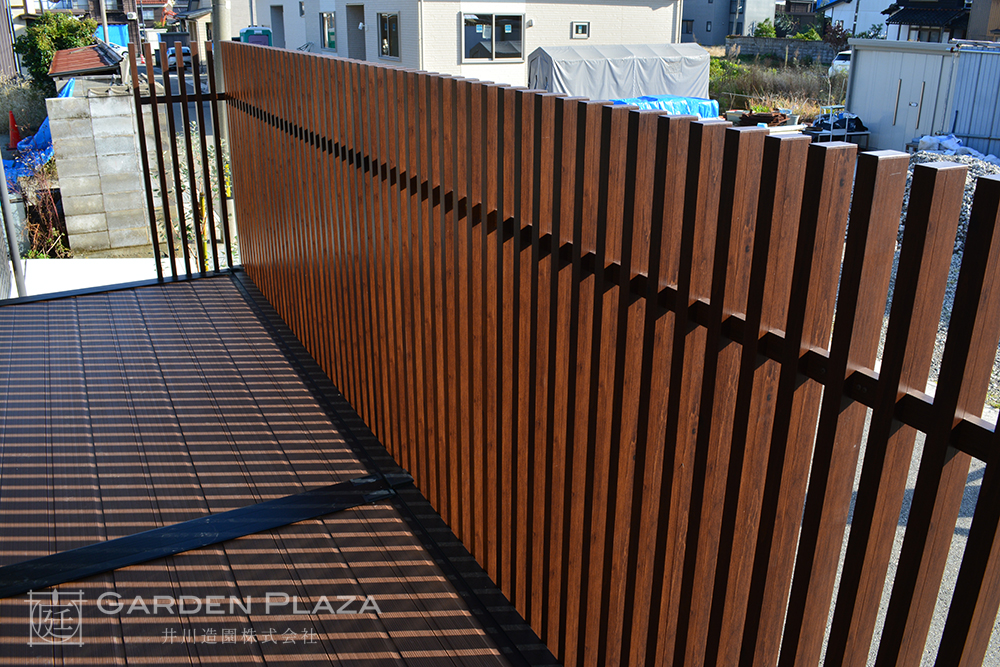 天然木の温かみを感じられるウッドフェンスは、 程よい目隠し効果を保ちながら 空間に優しい雰囲気をプラス。 植栽との相性も良く、外構全体を柔らかく。 リビングから自然につながるテラスは、 ゆったりと楽しめる半屋外空間。 ライフスタイルに合わせた 心地よいひとときを演出。