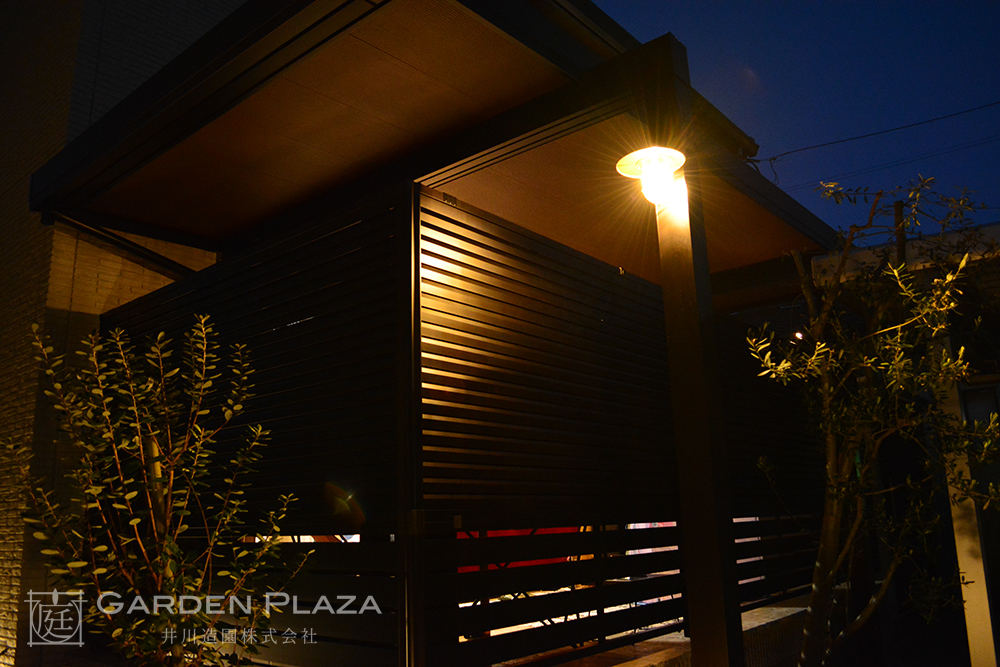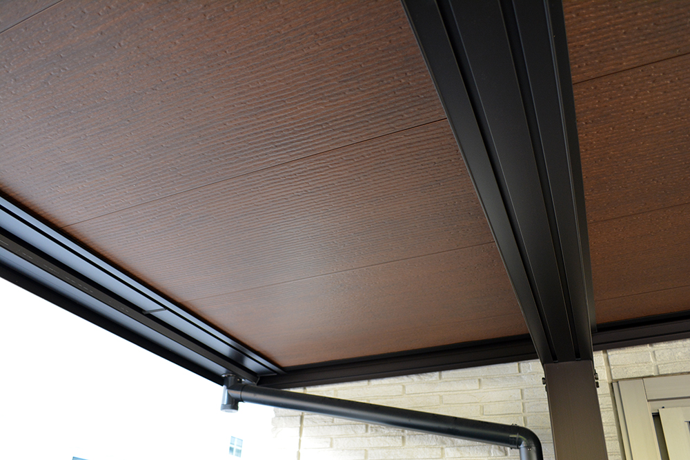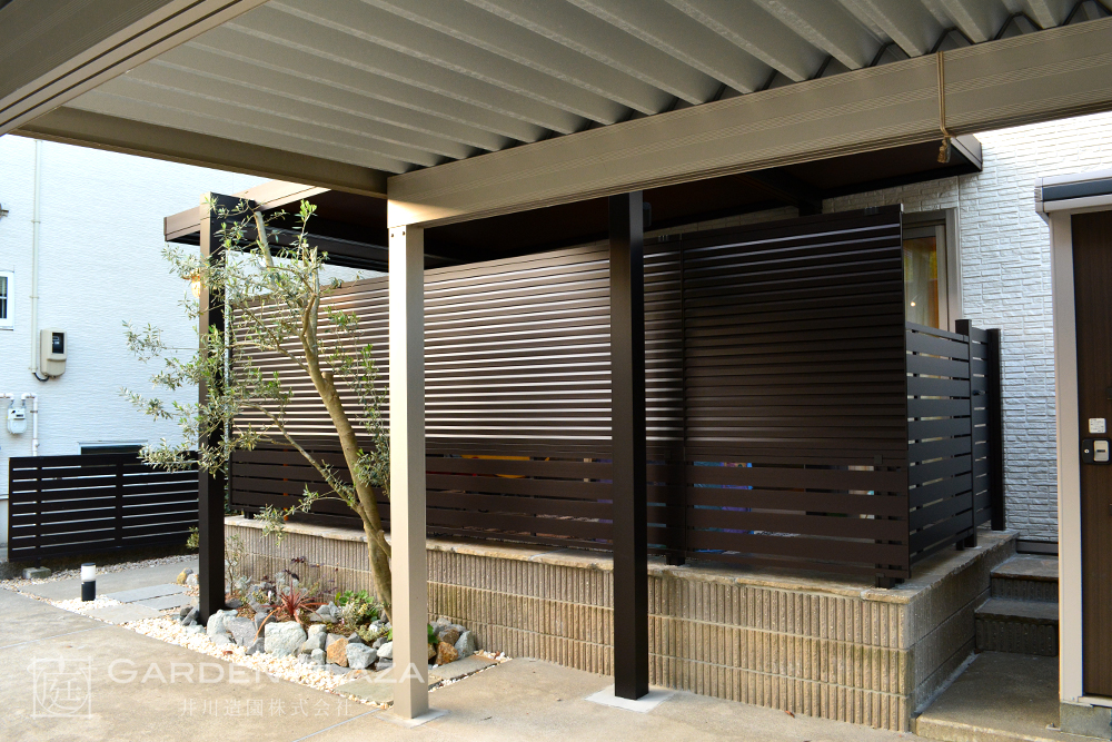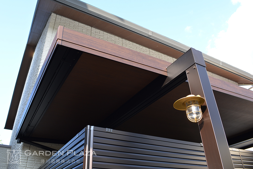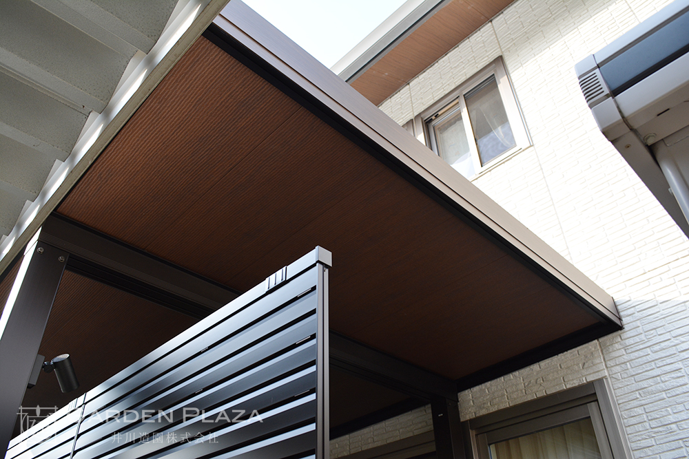 軒天カーポートに包まれた上質なタイルテラス空間